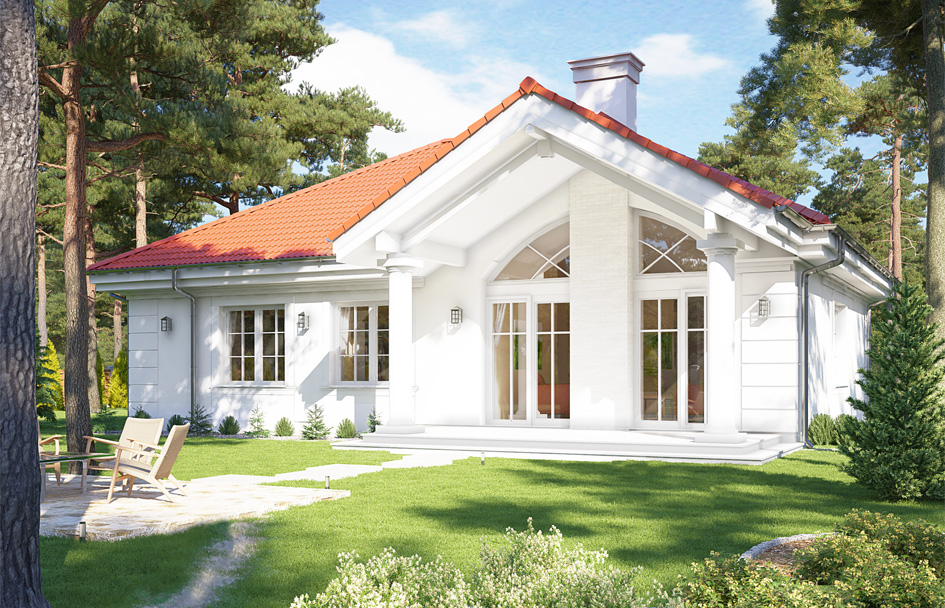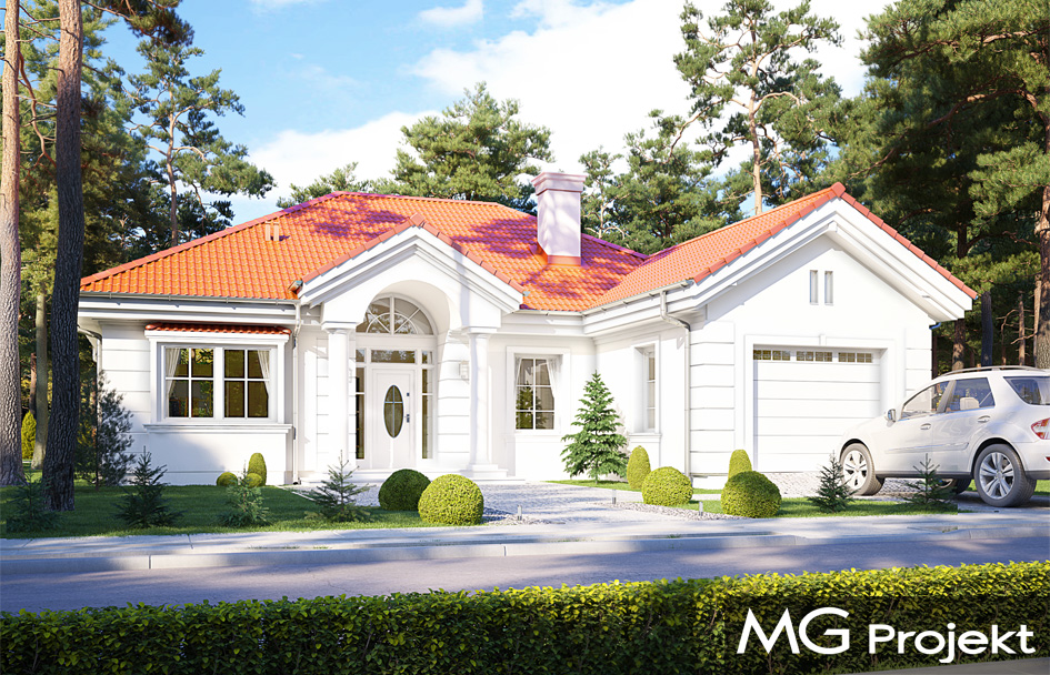 House on Park Street 2 is the cheapest, most economical version of the projects from the series of House on Park Street. This house plan is narrower and smaller than the base version, has a single garage, there is no attic (only an attic with pull-out ladder stairs), and the ceiling above the ground floor is designed in a wooden beam construction instead of a monolithic board - to lower the cost of implementation. At the same time, the ceiling was designed with a cladding of OSB boards over the gypsum plasterboard panel cladding, in order to avoid potential scratches on the ceilings. The architecture of the house is a reference to American suburban villas, and partly to the Polish manor house. The exterior of the house is classic - its interior has a contemporary, functional program and layout. The interior is divided into a living area, with a nice living room with dining room, connected to the hall and kitchen, and a night part with three bedrooms and a bathroom. Children's bedrooms have built-in wardrobes, a built-in wardrobe, a parents' bedroom - a dressing room. From the comfortable vestibule with wardrobes, we also get to the economic and garage part of the house - to the boiler room and garage. In the attic, the free storage space of the house was left. This small house due to the compact rectangular shape and sensible interior, is very functional, and thanks to the built-in wardrobes, pantry, wardrobe, attic, is very "capacious". The architecture of the house is calm and toned, it operates traditional details with the preservation of distance and taste. The front of the house is decorated with a representative entrance with wide doors, and from the rear elevation we have a large covered terrace with wide glazing that opens the living room to the garden. The house is a great proposition for people who, for financial or simply practical reasons, do not want to have a very large house, but also want to achieve maximum comfort and a sense of luxury within a limited space. At the same time, the materials, insulation and installations used in the project will make the building simple and inexpensive to build, and cheap in later maintenance.