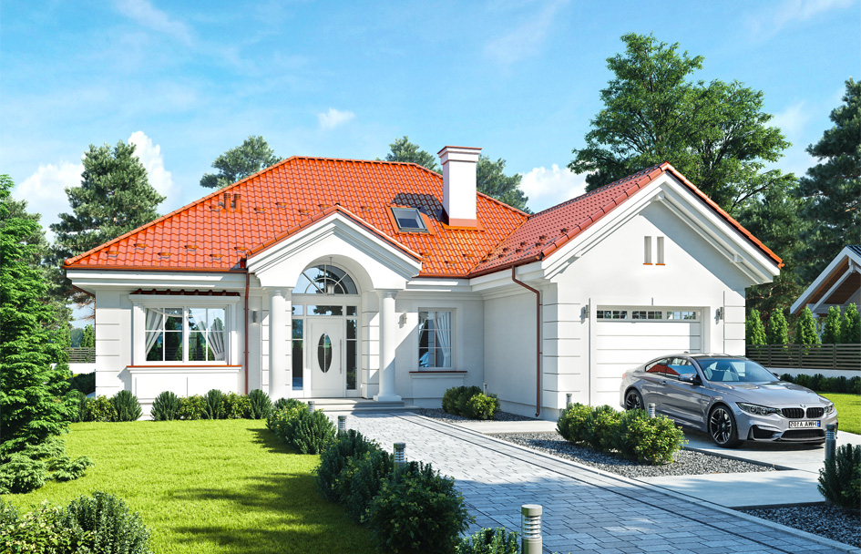 House on Park Street 5 is another variant version of the popular house plan from the series "House on Park Street", i.e. a version with a roof with a higher inclination angle, and a narrower block and a single garage. The house is smaller than the base version and is suitable for a narrower plot. The roof with an angle of 35 degrees will meet the harsher conditions of building, and besides, we gain a larger attic over the ground floor - actually an attic that can be converted into a usable attic if necessary. The architecture of the house is a reference to American villas from the suburbs, and to the Polish manor house, but in a more modern perspective. The building's body is rectangular, covered with a hipped roof, with a garage that protrudes slightly forward. In this way, a larger and more representative front part is created in front of the house. The entrance of the house has been underlined with a beautiful front portal with wide doors with sidelights. From the garden side, we have a large covered terrace, and a wide glazing connecting the living room with a terrace and garden. The interior of the house is functionally divided into three parts: day, night and utility -garage. From the nice vestibule, we pass wide doors straight to the living area, with living room, kitchen and hall. From the living part, we go to the bedroom - we have three bedrooms and a bathroom. Children's bedrooms have built-in wardrobes, parents' bedroom - a dressing room. We can also get to the utility room and garage from the vestibule. In the attic, we have a place to adapt to the attic consisting of two rooms and a bathroom. House on Park Street 5 is a perfect proposition for people planning a small house, but not wanting to give up their beauty, or agree to the maximum simplification of the architectural detail. The design thanks to the simple shape and construction will be inexpensive to implement, and the house will be cheap in later exploitation thanks to the use of modern and energy-saving materials and installations.