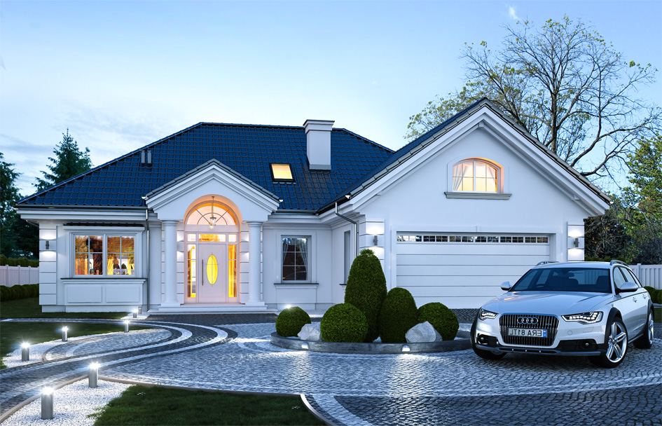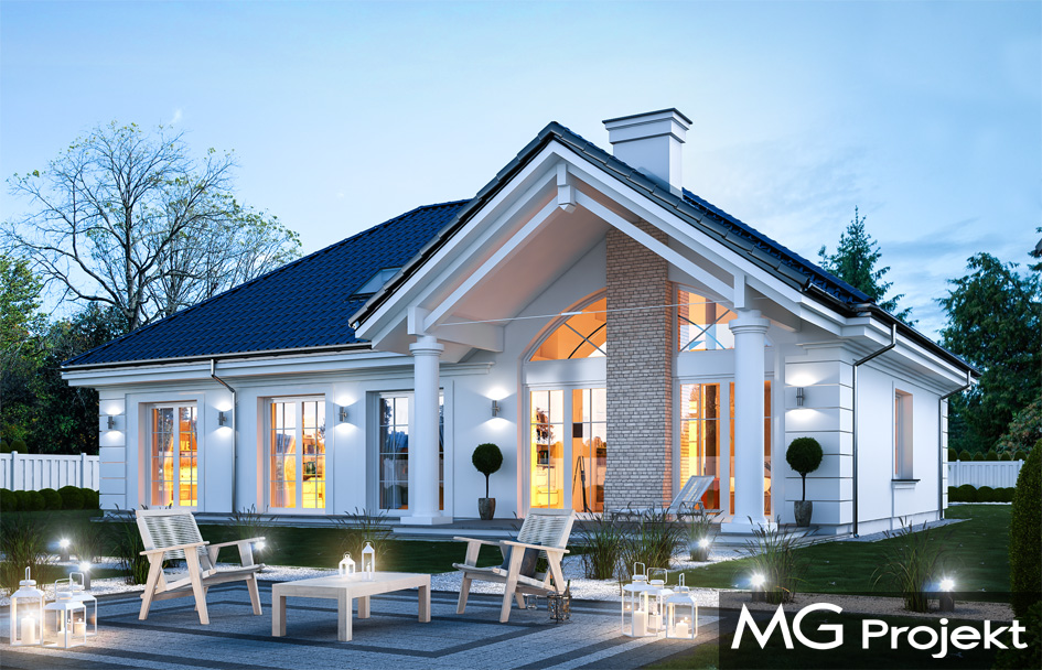House on Park Street 6 is another variant version of the popular house plan from the series "House on Park Street". This version is bigger hen other house plans. A single-family house for a 3-6-person family, one-storey, with an attic, which can be easily adapted and used for a usable attic. The building has a rectangular shape, covered with a fall roof. From the side of the front elevation, a two-station garage is added to it. The representative front of the house, reminiscent of American residences from the rich suburbs, is decorated with beautiful, roofed roofs above the entrance door. This is the central element of the front elevation that focuses the whole attention. Similarly from the garden side: the main element decorating the elevation is a beautiful roof over the terrace, and large glazed living room. The architecture of the house, saturated with classical details, although subdued, creates an elegant home with a timeless appearance. Interior: the entire utility part of the house is located on the ground floor. The attic can be arranged as an additional usable space, or it can be left as an attic. If it is used as an usable attic, then there are two rooms, a bathroom and a entresol above the space above the living room. We come to the house through a comfortable hall with a cloakroom, with a raised ceiling, from which we get to the lobby, or to the side - to the boiler room and garage. In front of the entrance, we enter the open living space of a combined living room and dining room, and a separate beautiful kitchen with a pantry. Above the living room we have open ceiling adding to the living room more space. The opening is connected with the entresol in the attic. In the night part of the house we have three bedrooms, toilet and bathroom. Children's bedrooms have built-in wardrobes. Parents' bedroom - a dressing room. All bedrooms have beautiful windows overlooking the garden. Above the garage there is an additional utility attic. The house is simple to build and energy-saving. This is a perfect proposition for people who do not plan to spend a very large amount on building a house, or do not want to give up their dreams without having a large plot of land.
