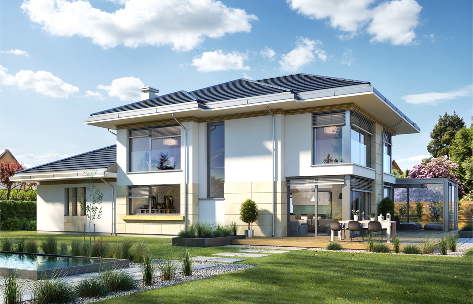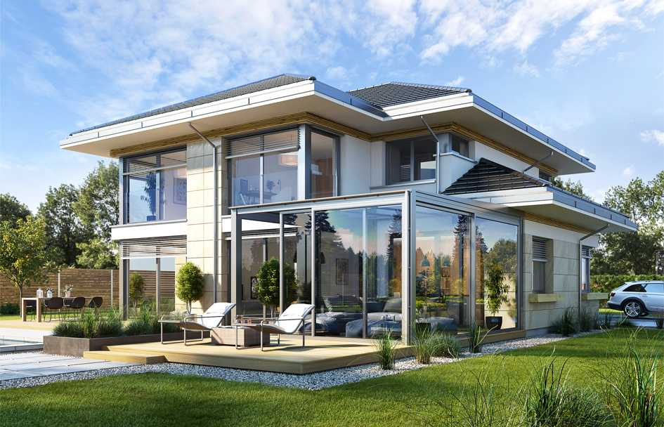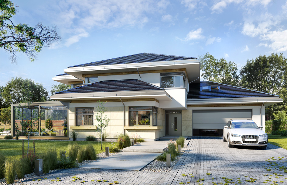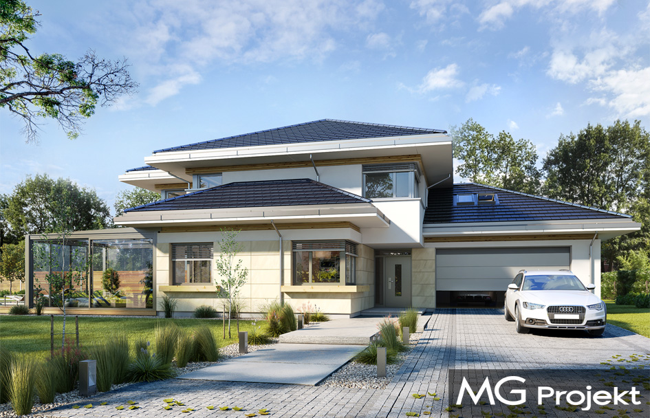 House with view 6 B is another proposition of a multi-storey house from the "Houses with a view" series. The presented project is a large two-story house for a family of 4-5 people, with a developed utility program, and an additional conservatory in the living area, dreamed by many Investors. The building was designed on the plan of the letter "T", with the main storey block, and two built-up parts of the ground floor. The architecture of the house is modern. The materials and details used create sophisticated suburban villa. The façade with horizontal stripes, and large corner glazing give the house an attractive appearance. The interior is an open single-space day part on the ground floor, economically and garage part, and bedrooms upstairs. There is no emptiness above the living room. We enter the house through a large hall straight into the lobby and living room. Living room, dining room and kitchen create a huge open shared space. The kitchen, as on the scale of the building is very large - it will fit in any size island. We have a pantry next to the kitchen and a walkway to the winter garden, where the family can eat or relax. This is a real additional home attraction. Next to it, we have a living room with a large dining table and lounge furniture. The basic version of the project has abandoned the fireplace - you can easily add it. From the lobby and the living room there is a representative, decorative staircase to the first floor. On the ground floor there is also an additional room - a study or a guest bedroom. Upstairs, we have two children's bedrooms, a bathroom, a laundry room, and a parents' apartment, with a bedroom, a dressing room and a bathroom, and additional access to the attic above the garage, which can be adapted as another dressing room or recreation room. A house with view 6 B is a functional, modern, rationally designed villa. The project used energy-saving solutions. The building will be inexpensive in later operation. This is a perfect proposition for people who dream of a beautiful, practical, practical home for their family.