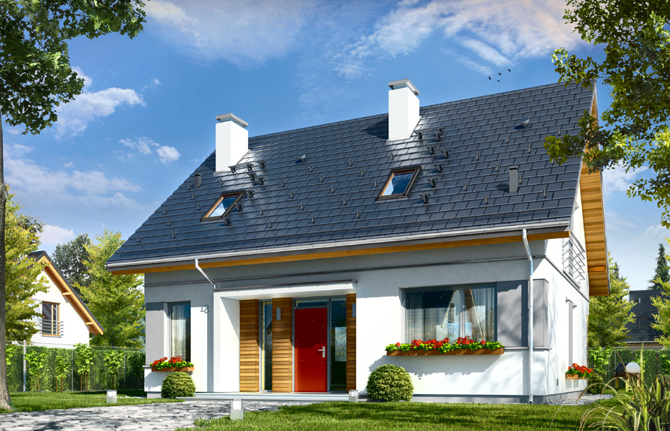 Ideal house plan is a detached house for a family of four to five people, bungalow with an attic, covered by symmetrical gable roof. The ideal, as the name suggests, has in itself everything you would expect from a comfortable home: comfortable, spacious and functionally interior designed, and a modern and aesthetic external solid. Simple construction, built on a rectangular plan, with a gable roof - no additional roofs and dormers make the construction is easy and inexpensive. Unpretentious architecture of the building fit into any environment. Modern details and materials used in facades are combined with the traditional form of the house with an attic. Interior of this house is divided into a living area on the ground floor and bedrooms on the attic. Living room with a hall and kitchen creates a large living space with dining area, fireplace wall and TV wall, and with the angle for a leisure furniture. Comfortable hall with representative staircase will create more spacious interior. On the ground floor there is an extra room - office or guest bedroom, bathroom with a shower, a large boiler room – on gas or solid fuel. In the kitchen is additionally provided a small pantry. On the attic designed three nice bedrooms, with dressing rooms and built-in wardrobes, and a bathroom was planned. The interior can be freely shaped and shared. This house plan occurs in a version without a garage, but it is very easy to plan a single or double garage on the side of the house – you can get to the garage through the utility room. Very good thermal insulation, modern technologies used and facilities make the house is energy efficient. Thanks to this makes it not only cheap and easy to build, but also affordable at a later use. We have a mirror version of this house plan.