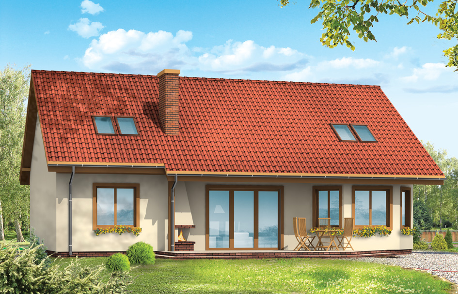 Sparkle house plan is a simple solid covered with a gable roof. This house plan was created for a family of four-five people. There are no windows in the side elevations so the house can be built in a plot with a width of 20.7 m. On the ground floor there is a large living room with fireplace (additional fireplace is on the terrace) connected with a dining room and two other rooms. On the attic there are three bedrooms with bathroom and a dressing room. The construction of the house allows to adopt rooms on the ground floor at the garage with utility room, or save up extra bathroom. Sparkle house plan is also available in a mirror version.
