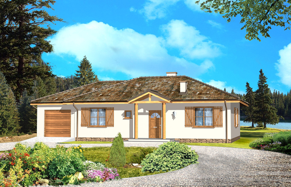 Like a dream with a garage house plan is a simple one-story house, recalling memories of traditional Polish manor house. Envelope roof cover the solid of the house and a garage. House perfectly meets the requirements of the family of 3-4 people. The building has a spacious interior divided into two parts: living - representative and night - intimate. There is also available an extended version of this house plan and a variant without a garage. We have also version in the construction of a wooden frame. This house plan is also available in mirror version.