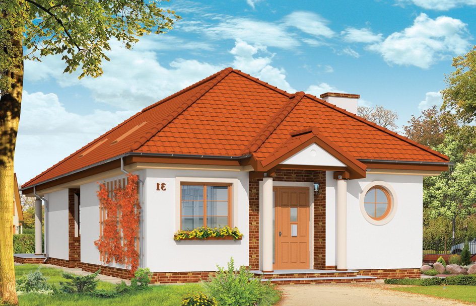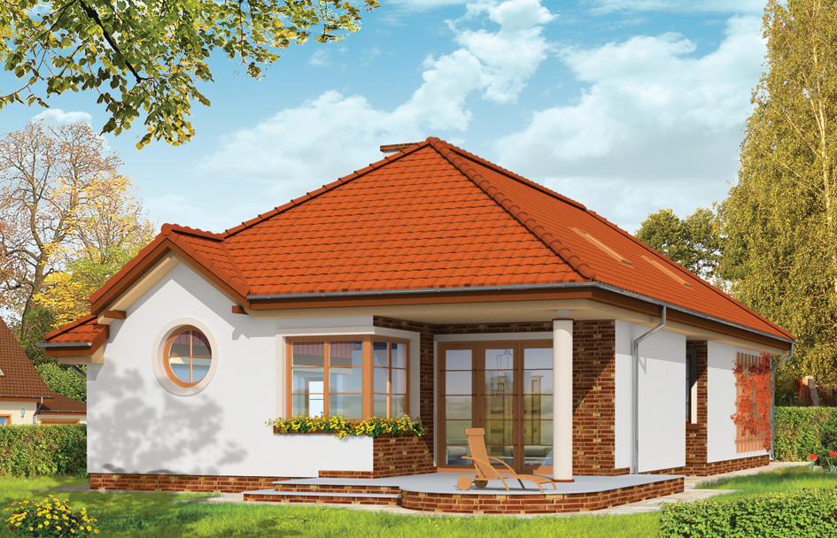 Dachshund house plan is a convenient building on a very narrow plot - even a 15-meter. The solid of the house and a garage is covered by the hipped roof. The interior of the house is planned is such way to be able to live on the ground floor in the first stage of building. The attic can be exploited for utility rooms. Interior of living room, dining room and lobby creates a large open space. From the living room you can go out to the covered terrace. This house plan is also available in mirror version.
