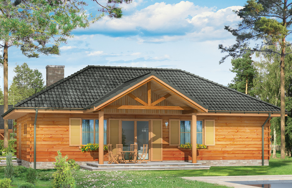 Swallow house plan is the perfect choice for a summer house, as well as year-round. This house plan is built with solid logs with internal insulated of mineral wool. The building has been designed for a family of four people. This house plan architecturally the best fit into suburban and rural areas. Quite simple shape covered by a hipped roof has been varied by picturesque garden entrance portico and a covered veranda where owners can sit in the afternoons - admiring their garden. The interior of the house is an open living area with a spacious kitchen, and night part - more private, with bedrooms. There was designed a large utility room designed for boiler room on the side of the house. This house plan foresees optional basement under utility room. Swallow house plan thanks to its simple form and structure is economical in building and in the later maintenance.