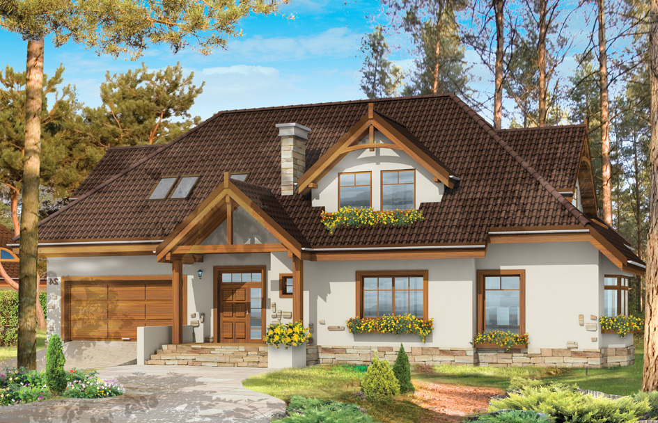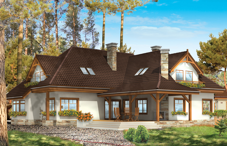 Ash tree house plan is a large, comfortable detached house for a nice plot. The building has been designed for the family of 4 to 7 people, with the possibility of fencing housing for seniors. The house plan of villa is scheduled on L-shaped so as to provide maximum protection and intimacy for a large, partially covered terrace. It's the perfect place to rest. The living area consists of living room, dining room, lounge and a large kitchen. In the lobby an elegant staircase wrapped around the central massive fireplace wall was designed. On the attic there are four bedrooms with bathrooms and dressing rooms there is also enlarge hall that can serve as a living room or tv room. Outside in the arcade garden the outdoor fireplace was also designed. There is also available a mirror version of the Ash tree house plan.