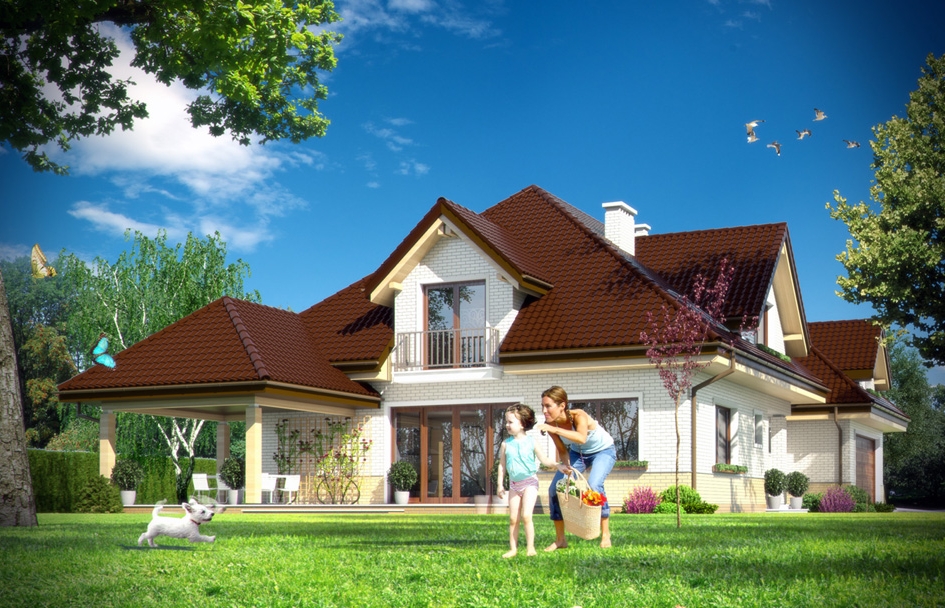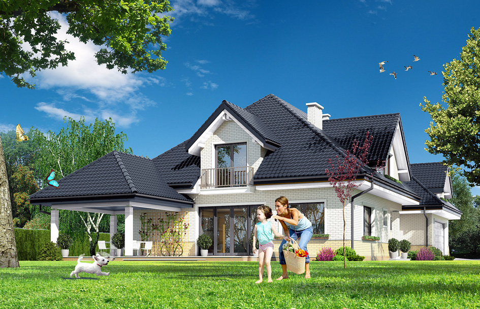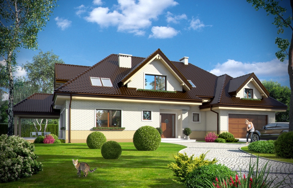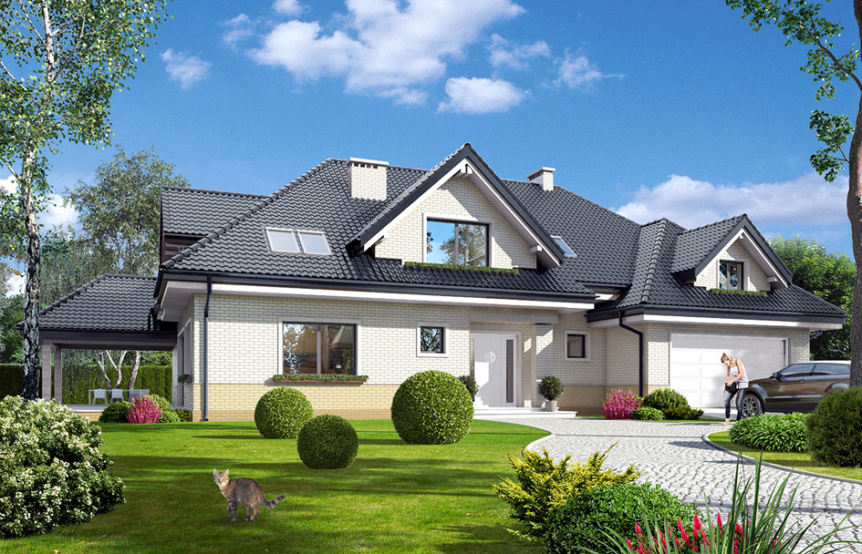 Joanna 2 house plan is a new version of the Joanna basic. This time, the house was enlarged. Exterior styling is changed. Elevation is decorated with clinker cladding. House gained a new different colors. Joanna 2 is the ideal suburban or rural residence, for investors seeking large space. It's a big house with lots of rooms and with a beautiful open, daily space and a very extensive part of the garage with utility part. Body of house is a typical for Polish roofer, with hipped roof covering a building in the shape of the letter "T". The traditional body of the house with attic and dormer windows has been combined with modern materials and colors. The whole creates a house with a modern but toned style. The interior was divided into daily and the utility part on the ground floor and in the attic was designed bedrooms and a spare recreational space and storage. On the ground floor the main room is the living room, connected with hall, kitchen and pantry. From the living room we go out to the partially roofed terrace. On the ground floor there is provided additional room with a bathroom, dressing room and utility part consisting of the garage, boiler room, and two additional storage rooms. In the attic we have a beautiful apartment parents with dressing rooms, bath room and terrace, children's bedrooms, a great common bathroom, extra guest room, and recreational space above the garage, with additional two attics. The house is truly luxurious.