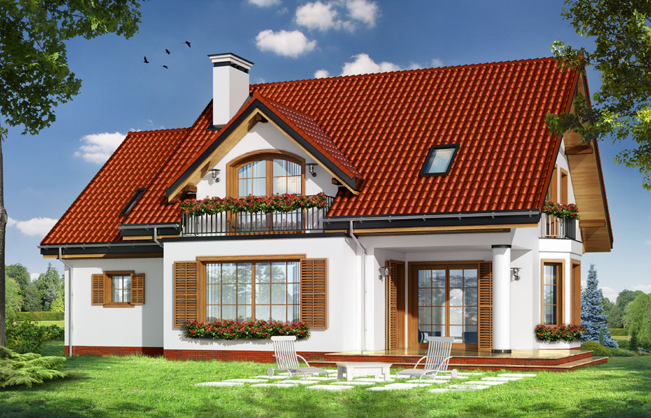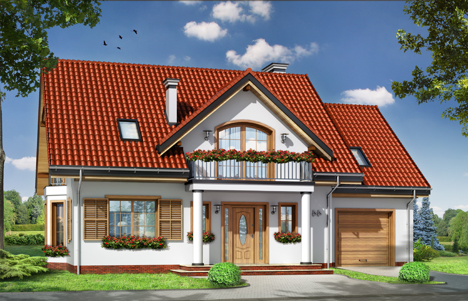 House plan Julka 4 is a variant version of the popular house plan Julka. The house plan is narrowed of the part of the width of the garage - changing it into a single garage, the attic was reduced, and the roofs was changed from the hipped to gable roofs. Thanks to this house can be located on plots where laws require gable roofs. House Julka 4, despite the simplification of the body looks very attractive. In the created side peaks were placed extra windows and little balcony over the bay window of the dining room. The front and rear dormer with balconies are more attractive then remaining facades. Built into the body of the house the garden arcade allows use of the terrace in a very sunny as well as rainy days. Inside the original layout is preserved - as in basic house plan - a breakdown for a living space on the ground floor including the living room, dining room, lobby with exposed stairs and partially open kitchen, and for the night space in the attic - bedrooms. In this version of the house plan, bedrooms and a bathroom can be a little bigger, because with a gable roof part of the "slant" was eliminated. In this house plan has an attic above the garage is also greater than in the Julka 2. Julka 4 house plan is available in a mirror version.