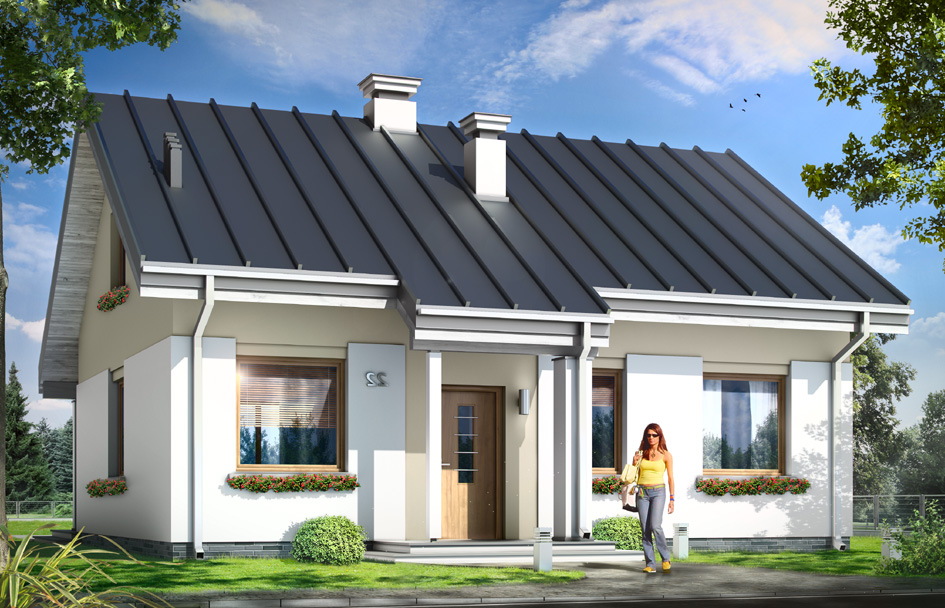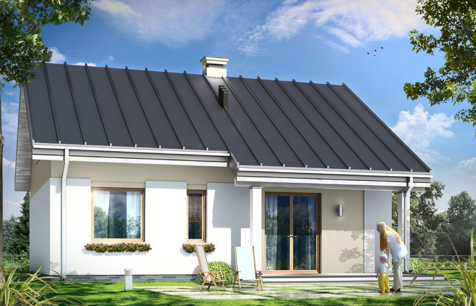 Kajtek house plan is a small house for a family of three - four people. This is one-storey building, covered by a gable roof. A simple shape of house combined with modern details and the materials used create a successful whole. Kajtek has unpretentious and original look. The interior of houses consist of a comfortable three-room apartment, with a living room, semi-open kitchen, two bedrooms, bathroom and boiler room accessible from the porch. Up the stairs you get to the attic, which – in house plan is treated as nonuse - very easily can be adapted to loft with additional rooms. In this house plan used separation the living part from the night part - with the bedrooms. In the living room the central element is a fireplace and stairs which adorning the interior. Wide balcony doors open the view on the partially covered terrace and a garden. There is also available a mirror version of this house plan.