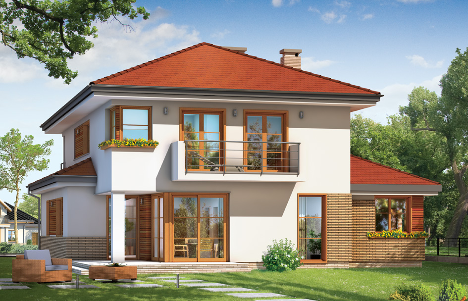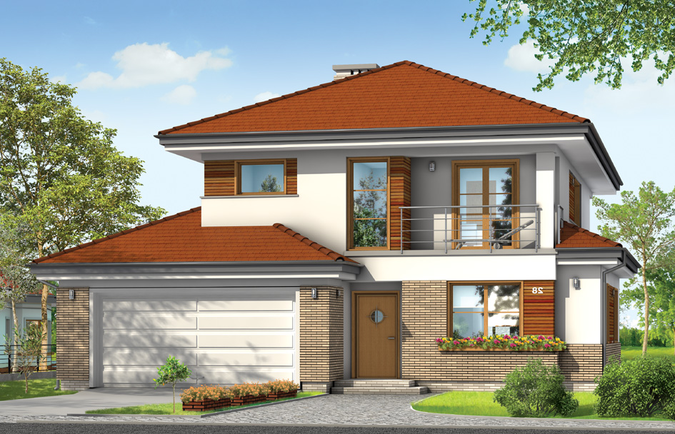 Cassiopeia 3 is house suitable for a family of 4-6 people. Two-storey house was covered by hipped roof. A compact and a simple form of house with the garage built in was varied by clinker facing and arcades - the entrance and garden. The project house we put special emphasis on the purity and simplicity of form building. Frugal detail block adds elegance. The interior is also planned so that the rooms were clear divisions - no corridors, and the rooms themselves were spacious and had optimal shape. The interior of the ground floor are: living area consisting of a living room with dining area, lounge area, partly open kitchen and utility room and garage. On the first floor are: three bedrooms with dressing rooms and built in wardrobes and the large bathroom. Additionally there is a possibility to economize an additional fourth room on the first floor by delated a dressing room. Cassiopeia 3 house plan has also a mirror version.