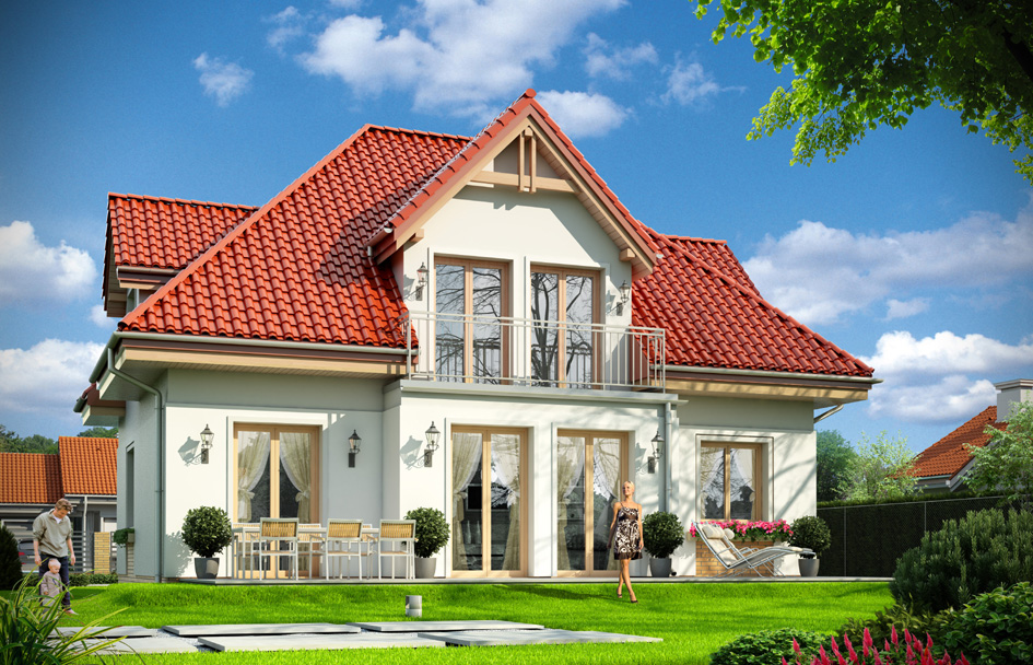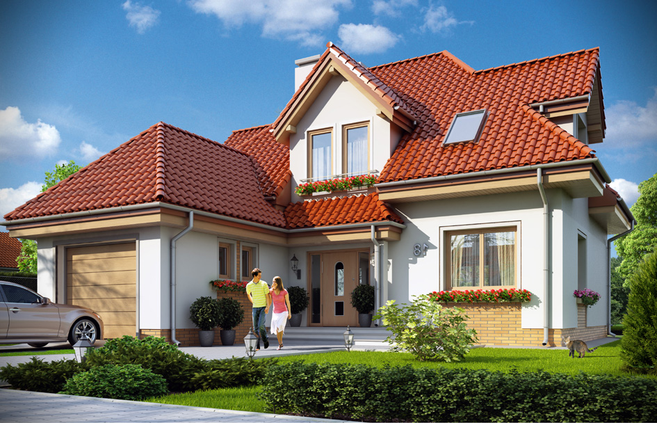 Classic house is designed for a family of four to five people. It is a bungalow with usable attic, and built in garage, covered by a hipped roof with dormers. Although the Classic house hasn’t got large usable space, it gives the impression of a solid traditional villa, with the representative front - accented by the wide front door, and impressive garden facade - with large glazed of living room and bedroom. The architecture refers to the pre-war house in manor style. At the same time it was used modern materials and finishing details. The building solid thanks to the move forward the garage to the front, allows to locate the house even on a relatively small plot. It is a rarity among the buildings of symmetrical facades and hipped roofs with ridge along the front. The interior is divided into a living area on the ground floor, and bedrooms on the attic. Combination of a living, dining room, hall and kitchen create open common space. With an extensive porch we get to the technical part of the house, with a garage and boiler room (gas boiler can be adjusted to a solid fuel stove). The ground floor provides extra room (office or bedroom), and bathroom with a shower. On the top floor there are three bedrooms - each with dormers and windows in the gables, wardrobe and comfortable bathroom. The house is very functional, and the rooms are spacious and easy to arrange. Good insulation and modern installations make the Classic is energy efficient building. Costs of further exploitation will not be high. This house plan is designed for people who appreciate at the same time original and traditional architecture, and they want a functional home, but also need something more than a simple gable roof house - a house with soul and character. There is also available a mirror version of this house