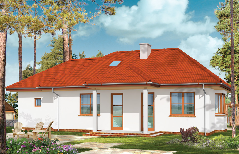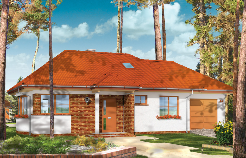 Jewel with garage house plan is a small building for a family of 3 or for a young couple with small children. This house plan in opposed to basic version has a garage. It can also be used as a cottage house. A simple shape of house without decorations is easy and inexpensive in building. The architectural details matched with the taste makes the house look pleasant. The interior is designed with the division into two zones, daily and nightly. We also have this house plan in a mirror version.