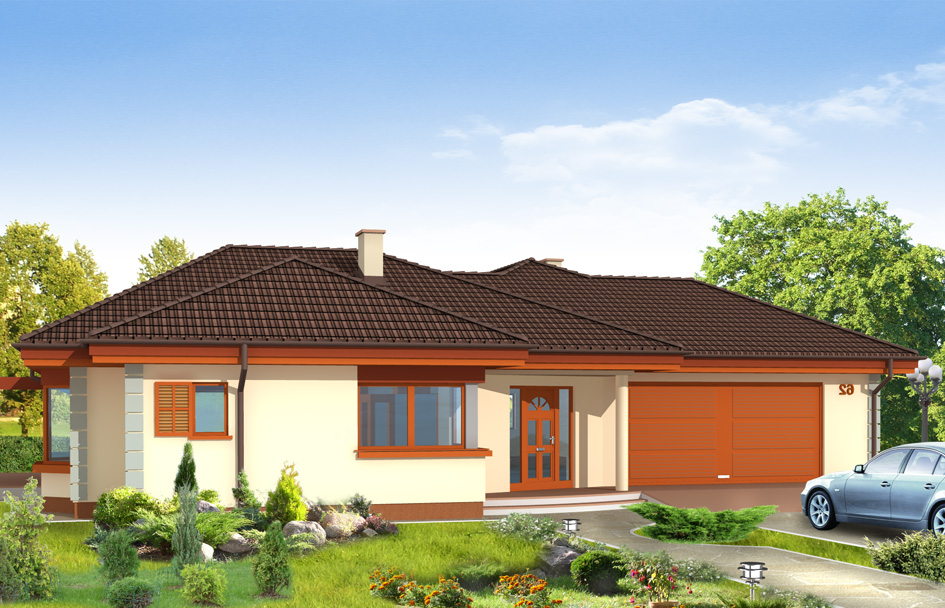 Comfortable house plan is a large, extensive house for a family of 4 to 6 people. It was designed for people who love contact with the plot, for people who don’t like running up the stairs. This house has a ground floor with an extensive application program, consisting of a living area, private part with a bedrooms and utility part with a double garage. The house has an attractive appearance from all sides. Despite a large surface area by fragmentation of solids it does not create the impression of a very large from the outside. There is a possibility of partial development of an attic, and increasing in the ceiling above the living room. We also have this house plan in a mirror version.