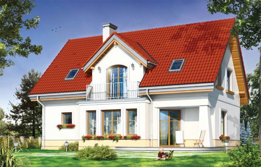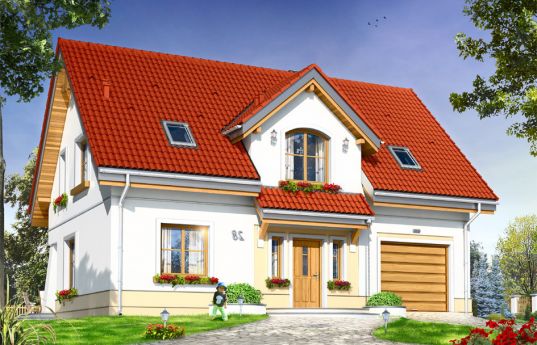 Clover house plan is a charming detached house for a family of four-five people - with attic, and built-in garage. Its simple shape and uncomplicated design allows for easy and inexpensive build. At the same time small area of the house, combined with functionality and a sensible layout of rooms, will give savings in subsequent maintenance of the building. The rectangular plan of the house cover a gabled roof, is decorated from the front and from the garden by wide dormer windows. External appearance combines traditional, solid form, with modern materials and architectural details. Light, simple shape, with symmetrical facades has the same time a lot of charm and elegance. The interior of the house was designed with the division on the ground floor - as living and utility part with a garage and attic - from bedroom of the household. On the ground floor managed to get a beautiful living room with dining area, connected with the spacious lobby, which exposes elegant staircase to the attic. On the lower floor there is a pretty easy to arrange kitchen, a large porch - connected with a garage and boiler room and toilet. From the living room the exit to the terrace and partly sheltered corner arcade was designed. In the attic there are designed three very nice bedroom and a large bathroom. Master bedroom has its own dressing room and little balcony. Alternatively we provide separation of partition wall of the fourth room, for example for a home office. There is also available a mirror version of this house plan.