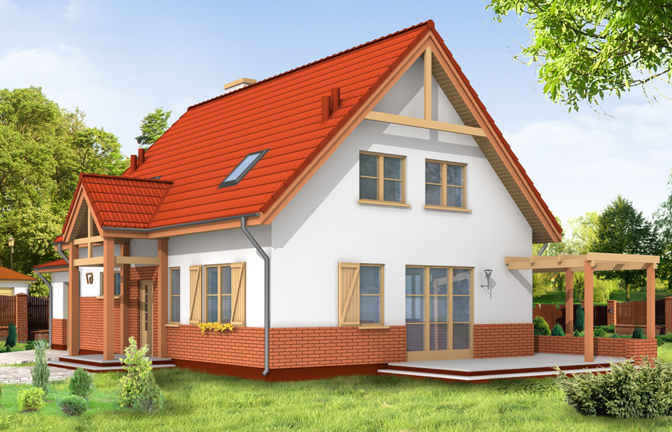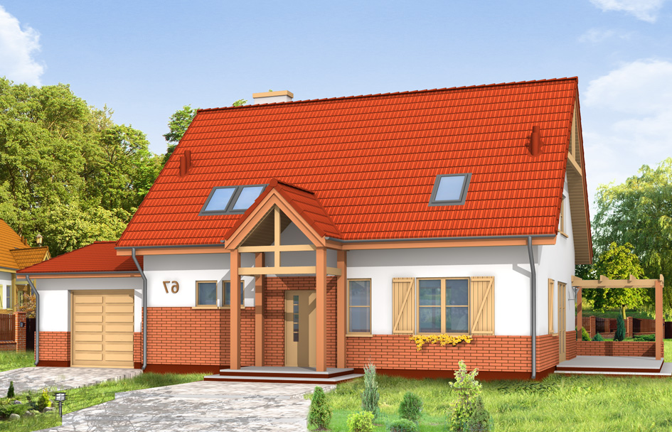 Forest nook house plan is storey house with attic and garage, designed for a family of 4 to 6 people. The building can be set up on a plot with unfavorable sunlight. The architecture of this project refers to the simple, traditional forms and details, in modern perspective. By using natural materials: brick, wood, ceramic tiles - the house fits perfectly in the surroundings. The interior of the house has a semi-open layout - living room connects to the hall and a terrace. On the ground floor there are moreover: room (office or bedroom), utility room, toilet with shower and a garage. In the attic there are three comfortable bedrooms, a bathroom and a dressing room. Forest nook house plan is also available in a mirror versions.