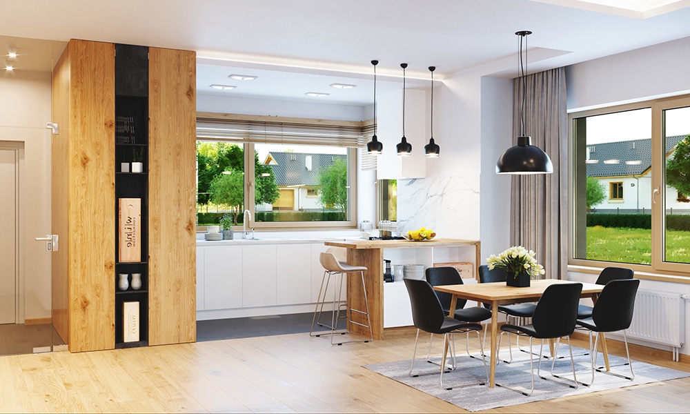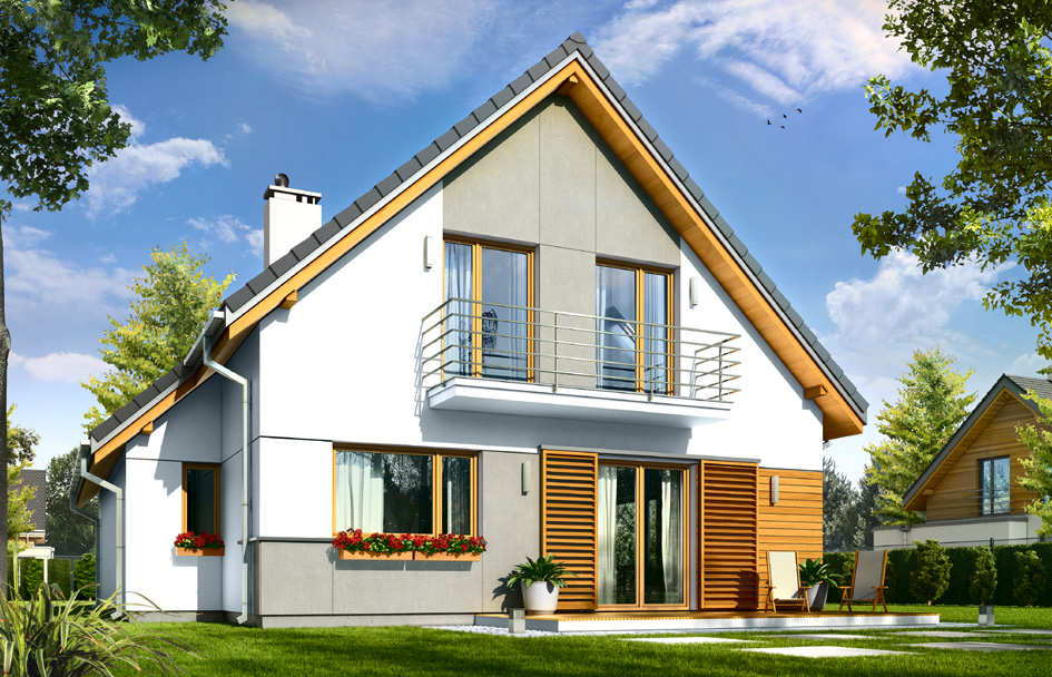 Lily of the valley house plan is a detached house for a family of 4 to 5 people. It is a house with usable attic covered by a gable roof, built on a rectangular plan with a built-in garage. The architectural form, materials, details, highlight the modern style of the building. Despite the small space house has everything that should be found in a detached house. On the ground floor, we have an open space with living room with fireplace and TV wall, dining area and open kitchen and hall. We also have an extra room - a bedroom or office, and garage with boiler room - accessible from the entrance vestibule. Nice glazing and opening to the terrace and garden illuminate the interior and open house on the surrounding nature. In the attic there are three bedrooms, a large bathroom and dressing room accessible from the parents' bedroom. The interiors are functional and easy to arrange. The house was designed in energy-saving technology. Excellent thermal insulation of external walls. Compact shape and simple design of the building will allow for a quick and inexpensive construction, and subsequent economical exploitations of the building.