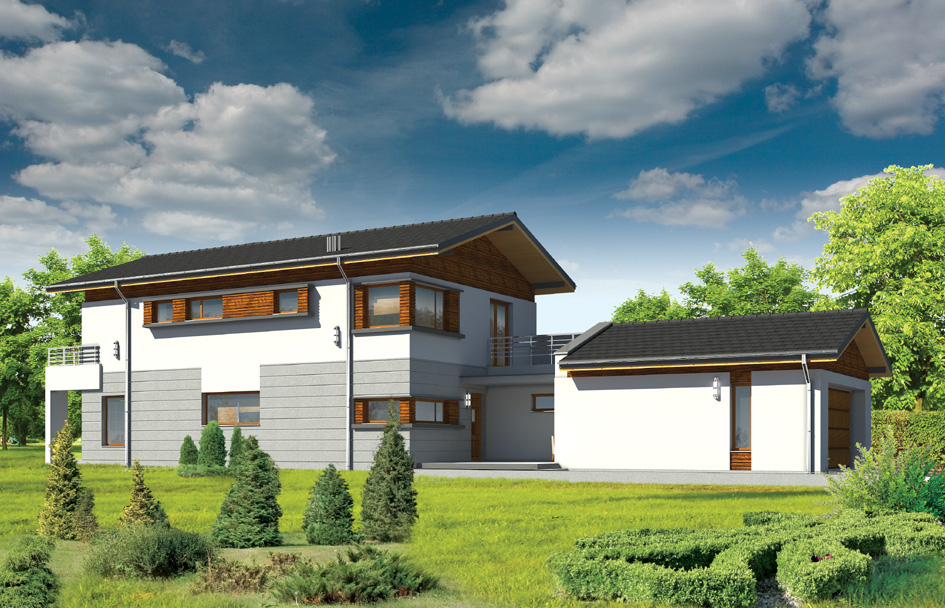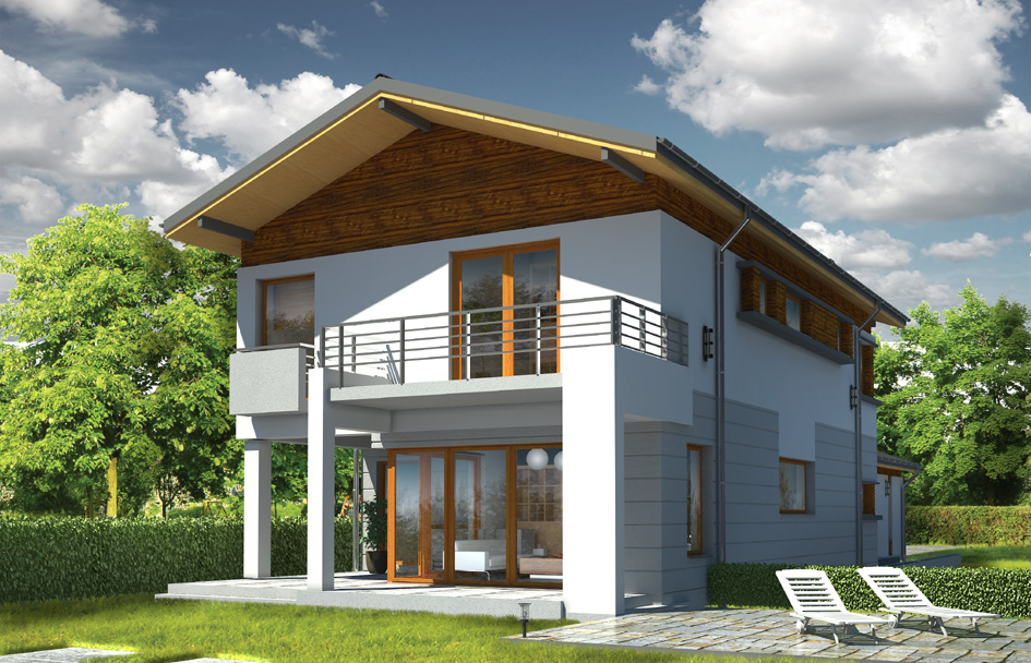 Lugano house plan is single-family villa for a family of four to five people. This storey house was covered with a symmetrical gable roof with ceramic tiles. The house has a modern character and was designed for use for a narrow plots of land on which the building must be in the form of a long narrow rectangular prism. Part of the garage was pulled out before the main body of the building, diversifying the front part. From the garden body of the house is decorated by corner living room window, arcade and terrace floor on the side pillars. Mild gabled roof with large hoods adds dynamics of the entire building. The interior is divided into a single space on the ground floor, with interesting, single-speed stairs, forming decoration of the living room and night part with four bedrooms and a large family bathroom. House despite a small area is designed functionally and rooms have a fair size. On the ground floor next to the living room you will find extra room - office or guest bedroom. Garage is connected with the rest of the house by a large technical room. From the living room you can admire the garden by the large glazed opening, connected with an arcade, outdoor fireplace and a terrace. Lugano house plan is also available in mirror version.