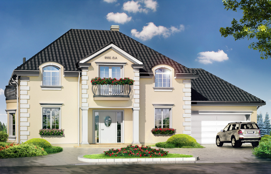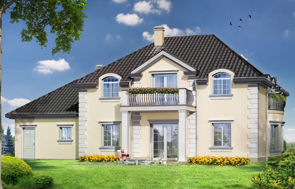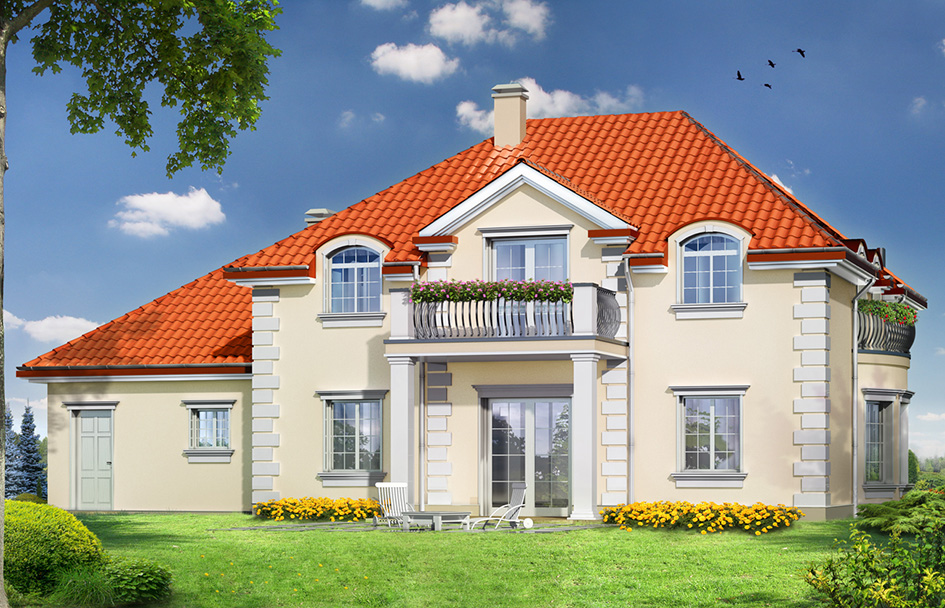 Magnate house plan is a representative stylish villa, referring to the style mansions and villas between the wars. Its timeless style combines with modern and functionally designed interior. The house is rectangular, single-storey body with an usable attic and an added part of the garage. The building was covered by a hipped roof. On the front and garden facade two-story portals was designed, supported by columns, ended with gable decorative fronts. Despite the fact that the main body of the building is the ground floor, the attic has a very high wall jamb, so almost the entire surface of the floor of the upper floor is usable. The interior of house was designed by secreting on the ground floor a large day area comprising: living room, dining room, lobby, and a partially open kitchen. Living room and dining room have reduced by two grades floor what’s make these rooms higher. Beautiful representative staircase in the lobby are also visible from the living room and dining room. On the ground floor is also a study - library (it can be adapted for an extra room with an entrance from the lobby) and extra room - such as a bedroom. In the utility part of house is located a convenient garage and a large boiler room. In the attic there are four bedrooms, the parents apartment, having its own bathroom and walk-in closet as well as an access to the terrace garden on the first floor. There is also available NF40 standard version and the mirror version of the Magnate.