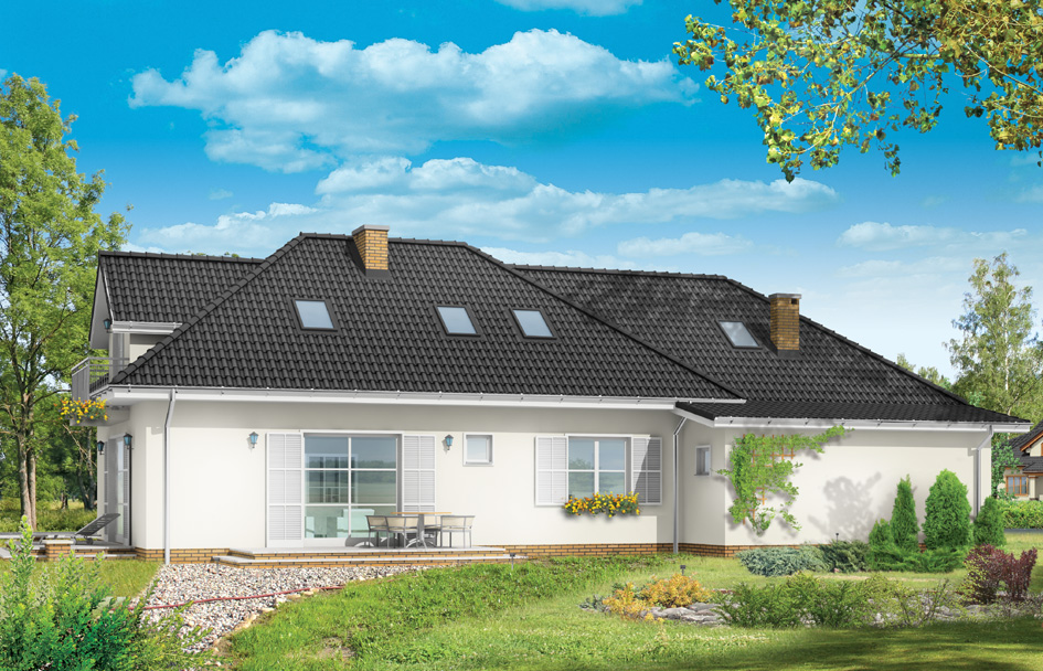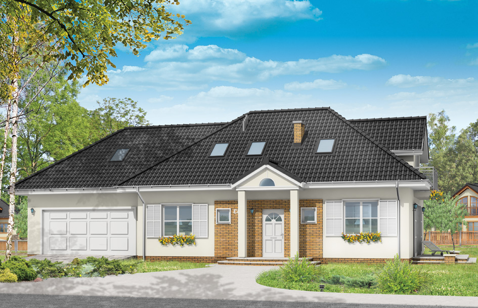 Magnolia is a house for family of four to five people. Magnolia is a bungalow with the usable attic and garage for two cars. This house plan with its architecture refers to a typical Polish manor house. In successfully it combined its traditional form with modern function, materials and details. Thanks to opening terraces on two sides, on the side and rear elevation, the house can be built on a plot with a garden in the back or on the side of the plot. Everything depends on the location in relation to the world side and the shape of the plot. During adapting the house to the location you can be resigned from one of the terraces. Inside of house, on the ground floor, living room with a dining area connected to the lobby and part of the kitchen, parents' bedroom with walk-in closet in the space under the stairs, and an additional small room - study room or a guest bedroom was designed. In the utility part of house garage and utility room - boiler room was planned. In the attic there are two children's bedrooms with private bathrooms. In Magnolia house attention should be also paid to the attic above the garage, which can be used as storage space.