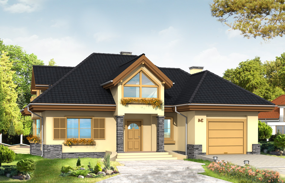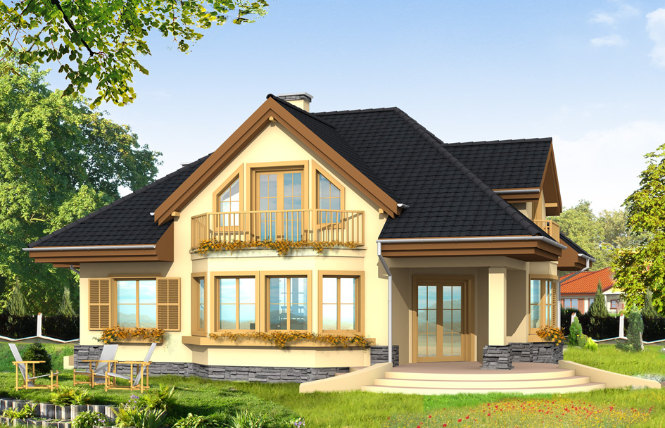 Maja house plan is the perfect choice for a family of four to five people. The building has an attractive body with a gentle hipped roof, which is adorned a large dormer windows with balconies and an extensive entrance arcade from the garden side. On the ground floor besides a large living room and an extra room for example on study or a guest bedroom – was designed. In the part of first floor are bedrooms and a large bathroom. The attic over the garage can be used as a laundry room with drying room. We have also a version of Maja house plan with four bedrooms in the attic.