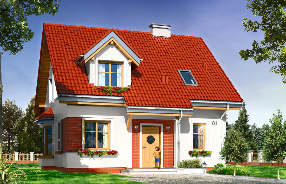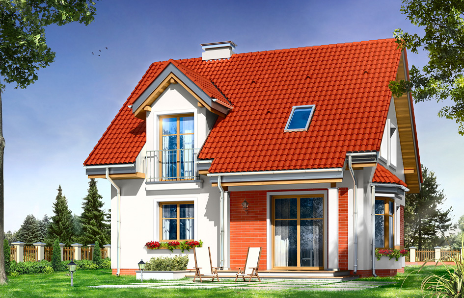 Michael is a lovely detached house - implemented as a "little brother" of the "Michalina" house plan - both houses are similar in size and layout of the interior, varying the shape of the roof. Michael was designed as a comfortable house for a family of four people - this is one floor building with the usable attic. The ground floor provides living area, with a living room, a dining room, a nice open kitchen hall and a large boiler room. On the top floor are three bedrooms and a comfortable bathroom. The traditional shape of the building, constructed on a square plan, has been covered by a gable roof with dormers. Front elevation varies the roof over the entrance, supported by a column and strut. Garden elevation decorate: dormer with a balcony and a roofing of the terrace supported by columns. The architecture of the house is quiet, at the same time retain the correct proportions of body. Used modern materials and interesting colors give a good effect of entirety. Michael is an excellent option for investors looking for a small, comfortable house for his family, taking into account cost savings, simplicity of construction and low cost of house maintenance. There is also a mirror version of Michael house.