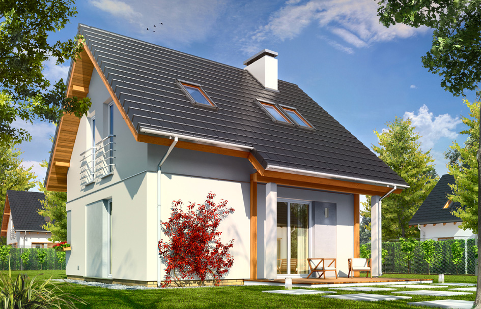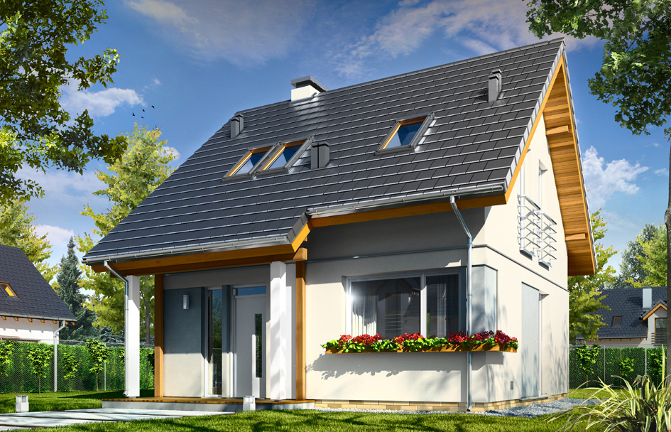 Mikrus is a nice, little detached house for a family of three to four people. Mikrus is small but roomy and functional at the same time. In a small cubic capacity we have managed to fit a fully-fledged four-room apartment. The house is year-round, it can also be used as summer house. This house has a very simple form. It is built on a square plan with a side of 7.3 meters, covered by a symmetrical gable roof. The building has a simple design, is easy and inexpensive to build, and at the same time - thanks to a good insulation - energy-saving and cheap in later maintaining. Exterior appearance of house combines the traditional form, with modern touches. It's a simple, economical in expression architecture that well fit in any environment. The interior of the house is divided into a living area on the ground floor and bedrooms in the attic. On the ground floor nice living room connects to the kitchen creating one open space. In the living room is a place for fireplace, TV wall, and the area with a dining table. Next to the atrium is designed bathroom and boiler room. The boiler room is a gas, but you can also apply a solid fuel boiler. Cleverly placed stairs do not take up much space and are the decoration of the living room. From the living room by wide patio doors we can go out to the partially covered terrace and garden. In the attic has managed to fit three small bedrooms and a bathroom. Attic can be divided in any other way - at the discretion of Investor - for example, into two larger bedrooms. Mikrus is inexpensive, easy to build and cheap to later maintain. It has everything you would expect from economical house plan. We have a mirror version of this house plan.