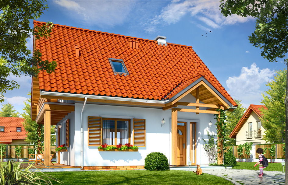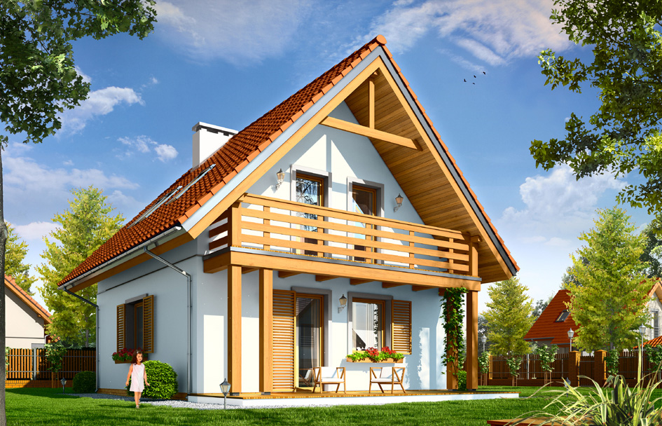Nice house is designed for a family of three to four people. The house was designed as a family all year round, but it can also serve as summer house. The rectangular of the ground floor was covered with a gable roof, which is located in his attic. An interesting body is diversified by terrace roofing and balcony from the garden side, and supported by two small columns roof over the entrance. Architecture of house combines traditional form, with modern detail and materials. Thanks to its unpretentiousness this house fits perfectly in any environment. The interior of the house is divided into a living area on the ground floor and bedrooms in the attic. Living room, kitchen and foyer form a large open common space. Cleverly positioned staircase are decoration of the living room. Centrally located chimney supports the both a fireplace in the living room and the boiler in the neighboring boiler room. The boiler was designed as a gas, but it can be easily adapted for solid fuel furnace. In the attic there are three small bedrooms and a bathroom. Partition walls of the attic can be easily and freely adjusted by changing the configuration of the rooms. Nice house plan takes into account a very good warming partitions. The house is energy efficient - equipped in the modern installations. With simple and inexpensive construction on the one hand and used energy-saving technologies, on the other hand, the house will be cheap in the construction and subsequent exploitation. This house plan is an ideal solution for counting the money investors wishing to live in affordable and charming detached house. Nice house is available in a mirror version.