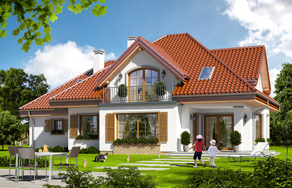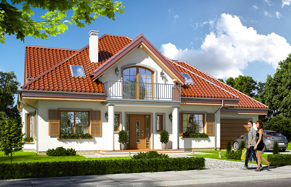 Ophelia 2 house plan is a variant version of the popular house plan Ophelia. This is version with a single garage, slightly smaller, suitable for narrow plot. Ophelia 2 refers to the timeless Polish style mansion or classic Polish roofer, but in modern style. The house has a symmetrical body of house. and proper proportions. Storey body of the house is covered with a hipped roof, with large dormer windows on three sides that minimize the slants in the attic rooms. On the fourth side is a body of the garage with a roof hiding loft / attic. Access to the house is emphasized by representational portico with columns. From the garden we have a corner arcade - roofed terrace and a beautiful bay window of the living room. The interior of the house is functional and has many rooms. On the ground floor there is a large living space connected to the living room, dining room, lobby, and a partially open kitchen. From representative hall, we have access to two additional rooms on the ground floor, which is rare in houses of this size. These rooms can be used for example as a study or a guest bedroom, and the second (with bathroom) as a senior room. The ground floor has the kitchen, pantry, quite big porch, bathroom, garage and boiler room. In the attic there are three bedrooms and a large bathroom. Two bedrooms have their own dressing rooms and balconies. Above the garage is a loft that can be used as a usable attic and there you can arrange an extra room. Ophelia 2 is an excellent choice for those who enjoy traditional style house. Traditional in form, and simultaneously with a modern, functional interior, with modern materials and technologies. The house is energy efficient and relatively simple and inexpensive to build.