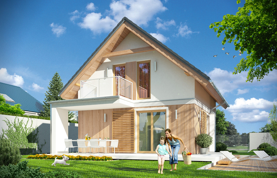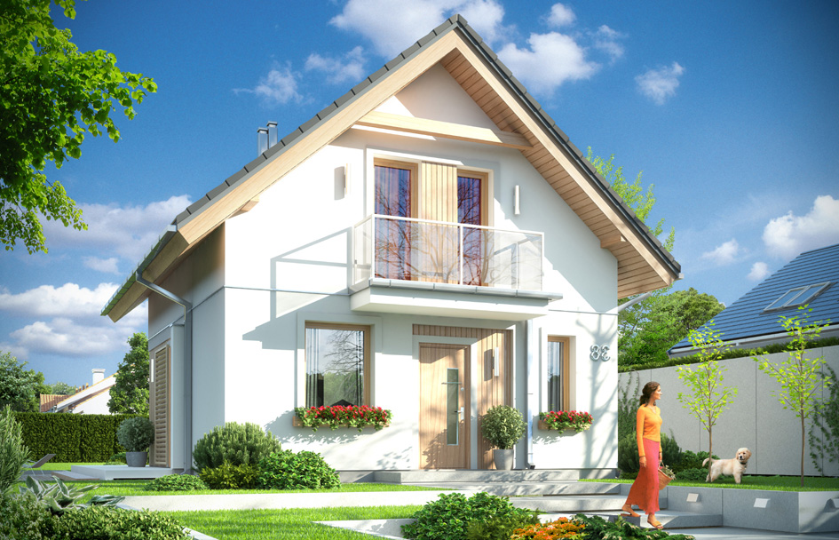 Olenka house plan is a charming option for a family of three-four people. House was designed at the plan similar to a square, it has usable attic covered with gable roof. Olenka has all the advantages to become the favorite of their future owners. Exterior architecture of house is a combination of modern details and materials from the traditional form of roof house. The project, on the one hand, it is modest and restrained in expression, on the other hand is modern, attractive and fresh. Front of house is decorated with wall claddings made of wood, and a balcony who is also a roofing over the entrance. Garden elevation varies the balcony - arcade supported on the wall - a pole and a wooden cladding of the walls. The interior of house was divided traditionally on the ground floor with a living area and attic - with bedrooms and a bathroom. On the ground floor living room is connected with the hall and kitchen, creating a single space with a dinning corner, television and fireplace wall, and wide glass doors to the terrace and garden. Gas boiler located at the vestibule can be very easily converted into a solid fuel boiler. In the attic there are bedrooms with built in wardrobes and a bathroom. The house has excellent thermal insulation, uses modern systems and technologies, making it energy efficient. The correct proportion to the amount of volume envelope - walls and ceilings, will allow for low maintenance costs of the building. With a simple design, Olenka is inexpensive to build. The project occurs in the version without a garage, but you can easily add a garage to the side of the house. There is also available a mirror version of this house plan.