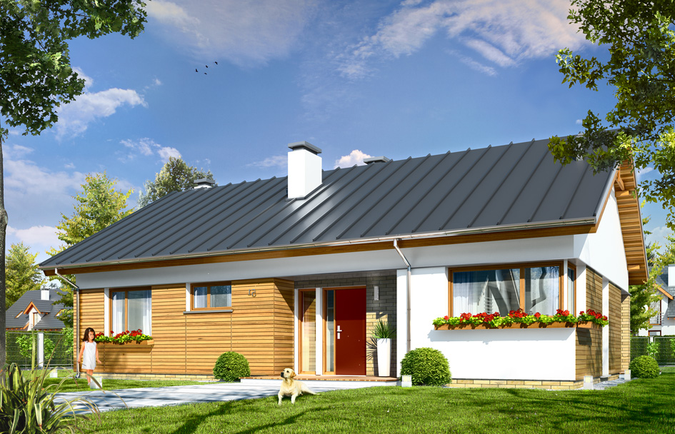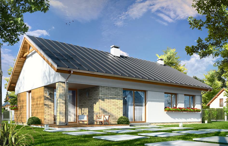 Olive house plan is a one-story single-family house, for a family of four people, with attic to adapt, covered by symmetrical gable roof. Simple modern shape of the building is decorated with original window woodwork, and wooden and clinker wall claddings. The traditional form of one-story house was designed on a rectangular plan, and has been combined with modern detail and materials. Front elevation varies the arcade entrance and a wooden wall cladding. The corner kitchen window adds a front some character. The house from the garden was enrich by corner arcade of terrace and extensive glazing of living room. Contemporary style is very easy to model and modify. Olive house may well have a roof with tiles or walls with rustication. The interior has traditional layout. Readable division of a living area with living room, dining room, kitchen, hall and part of the night - with bedrooms and bathrooms. Gas boiler room located at the entrance can be easily adapted to a solid fuel stove. Living room with dining area is very easy to arrange. Kitchen has its own pantry - a dream of many housewife. Three comfortable bedrooms with space for built-in wardrobes border with two bathrooms. Small bathroom with toilet and shower serves as the daily toilet and an additional bathroom at the same time. The stairs in the hallway lead us to the attic, which owners can freely use as extra storage space or usable space. House was designed as an energy-efficient, using modern materials, systems and technologies. It is cheap in construction and subsequent maintenance. The basic version of Olive does not have a garage, but you can easily build into it a single or double garage. You can also join the detached garage building. There is also available a mirror version of this house plan.