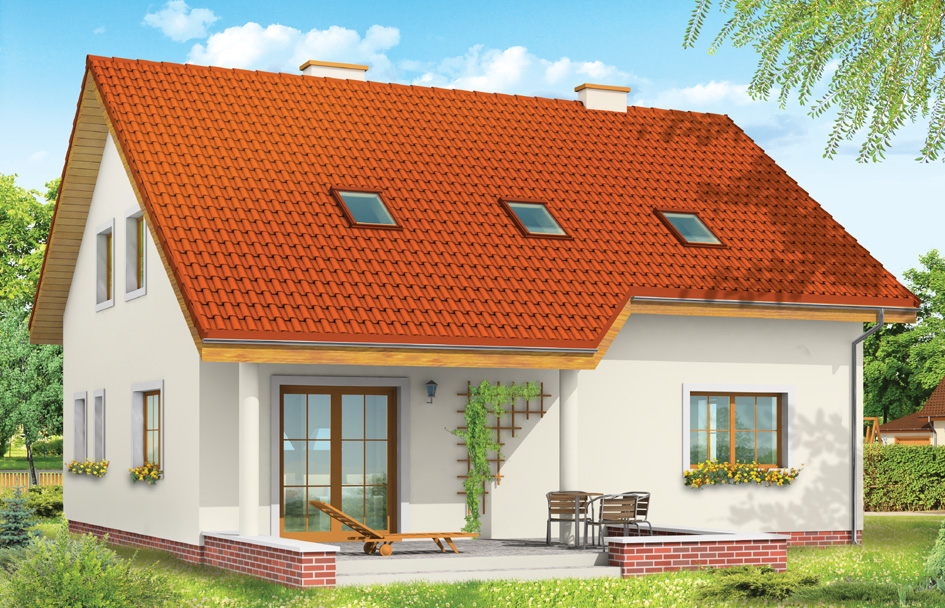 On common is a detached house designed for three generations of the family, with a separate apartment for grandparents or adult children. Solid of house is simple – it is a rectangular covered by attic and a gable roof. The entrance of the house is accentuated by two columns. From the garden there is a covered terrace. On the ground floor is common for both large vestibule of the entrance to the boiler room. In the part of a separate apartments there is living room with kitchenette, bathroom and bedroom. In the rest of the ground floor thee is living room with dining area and comfortable staircase and a kitchen with pantry. On the top floor there are three bedrooms with two bathrooms. One of the bedrooms is a separate part of your house with their bathroom and dressing room. The house can be also adapted by eliminating a separate apartment and turning them into a garage and, for example. office room accessible from the living room.