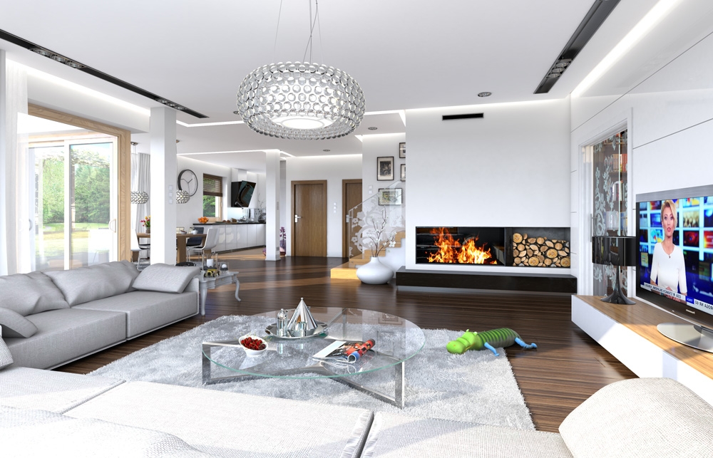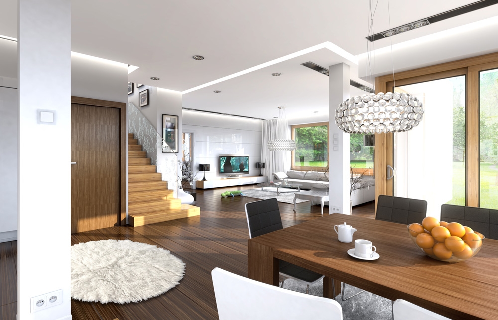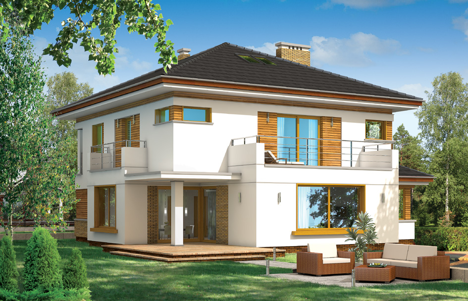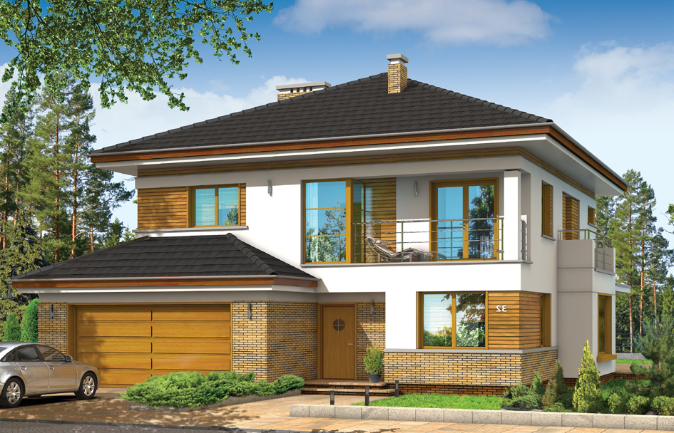 Opal house plan has been created for a family of four to five people. House is storey urban villa with modern architecture, covered by a hipped roof. The compact body of the building with a built garage and an arcade from the garden, was curiously decorated with clinker and wooden cladding façade and loggias, arcade entrance and large balcony behind the house. All elements form a coherent and calm whole. On the ground floor there was designed a large room in a shape similar to a square, with dining room and hall, with a partially open kitchen and an extra room - study or a guest bedroom. The location of the stairs in a central place will provide additional interior decoration of open ground. On the first floor there are bedrooms with a separate apartment parents, with its own bathroom, dressing room and large balcony-terrace overlooking the garden. On the first floor, if necessary, you can save an additional fourth bedroom - instead laundry and wardrobe. There is also available a mirror version of this house plan.