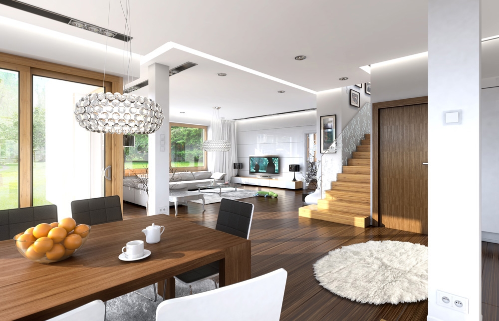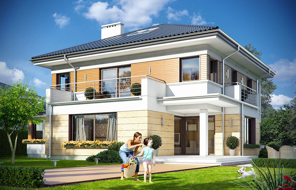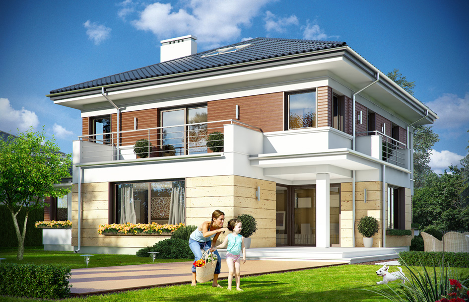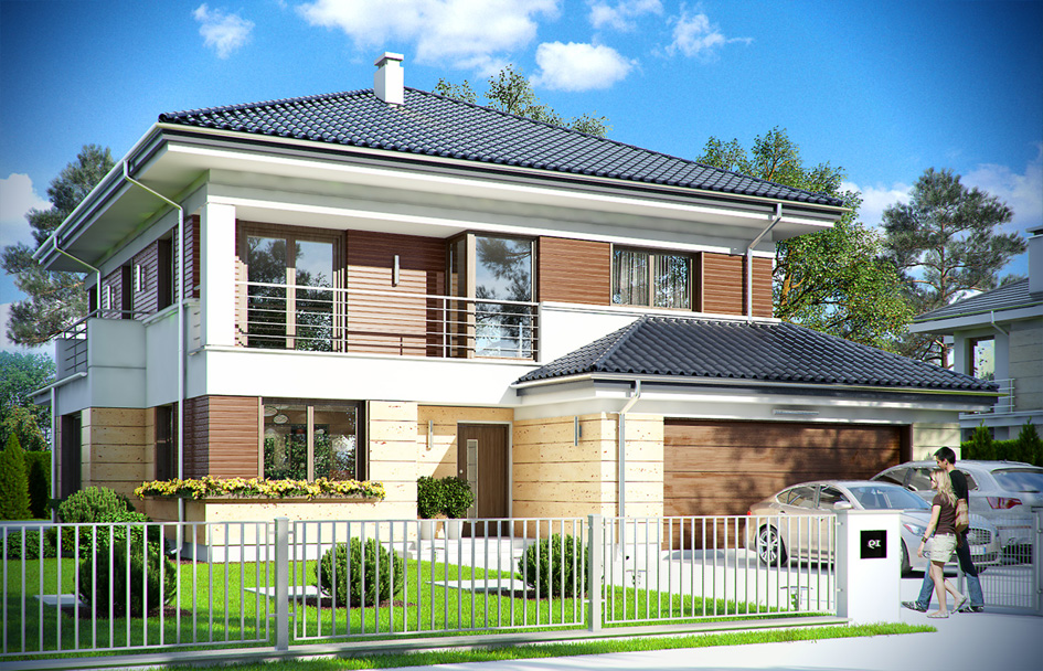 Opal 2 house plan is a modified version of the popular detached house Opal. The house was a little enlarged in comparison to its predecessor. Opal 2 has a larger garage and utility part. The external appearance of the building has changed - Opal 2 is even more presentable and comfortable. The house was designed for a family of four to six people who prefer storey buildings, without the "slant", who appreciate the toned modern architecture, with interesting glazing, facades decorated by diverse finishing materials, such as wood or stone. The clear shape of the building consists of storey part covered by roofed envelope, and built another garage and bay windows. The interior of the house is divided into a living area on the ground floor (with adjoining utility rooms), and the bedrooms upstairs. One space of the living room, dining room, hall and kitchen creates a comfortable surface area. Centrally located representative stairs, or fireplace wall - are decorations of the ground floor interior. On the ground floor there were also a place for additional space - office or guest bedroom. Truly great is here the garage, with plenty of space for additional equipment. There is also quite big boiler room. On the first floor we have the luxury apartment of parents - with its own bathroom and dressing room, and two bedrooms for children with bathrooms and dressing rooms. There is also room for an extra small room, for example, laundry-room, drying-room, freely according to the wishes of the Investor. In the attic an extra space can be utilized for utility purposes. Energy efficient solutions in the house will significantly reduce the cost of exploitation of your house - especially heating costs.