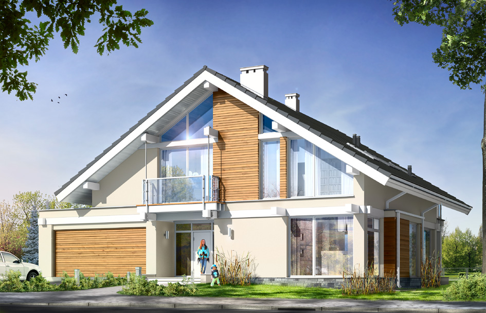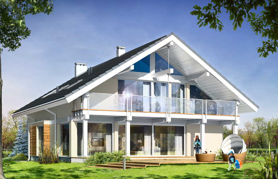 Open house is a beautiful, original detached house, designed for a family of four- to six people. It is characterized by modern architecture with lots of glass and openings - is dedicated to customers who want to stand out by an interesting, well thought out and functional building. This house was designed as a one-storey building with attic, with a very bright layout design, based on a grid of columns and binding joists. House was covered by fairly mild gable roof. In an interesting and consistent manner introduced here staggered arrangement of the full exterior walls and fragments of fully-glazed, which gives the façades light and the interior a unique character. Lacks the typical window sills and radiators hanging under the windows. In the traditional form of the house with a gable roof, hid modern architecture with character. Building at the same time, by using suitable materials, saves energy - thus is inexpensive to maintain. Interior of the house has been classically divided for living floor and an attic with a bedrooms. On the ground floor by the large glass atrium we get to the central hall, with a representational staircase, combined with living room and kitchen. Very nice kitchen with island and dining area, combined with the dining and living room. In the living room attention paid primarily glass wall opening the house to the covered terrace and garden, and - on the other side - the central fireplace and a TV wall. On the ground floor there is an extra room – e.g. office, garage and boiler room. In the attic there are: parents' apartment - with a bathroom and dressing room, three further bedrooms with en suite bathroom, and laundry facilities. Over the whole there is still a small attic - studio. Open house plan is a proposition courage Investors who like large glassing, nice contrasts in house silhouette and its interior. There is also available a mirror version of this house plan.