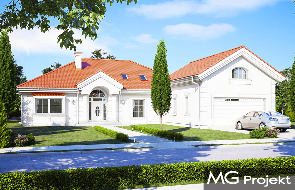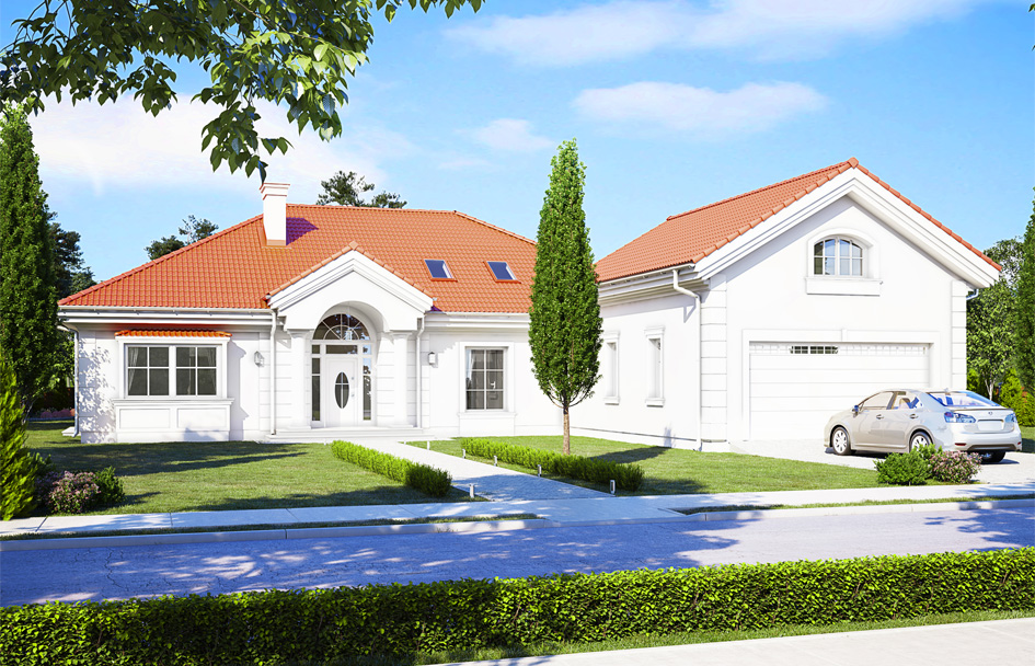Park Residence 3 option D house plan is another house project from the collection of Park Residence houses. This time it is a project of Park Residence 3 option D. Although the design retains a similar style and details, it differs fundamentally from the base version. First of all, the building is narrowed, reduced, has an attic arranged, and besides it has an additional flat - servant's house for the housekeeper above the garage in the attic. The architecture of the house refers to the Polish manor house and the details of American residences. The front elevation is varied with a beautiful entrance arcade with columns and an arched window. The built-in garage part creates a side outbuilding, and the entire front is arranged in the letter L. From the garden side the house is decorated with a wide arcade over the terrace and a beautiful high arched window of the living room, opening the interior to the garden. A few words about the interior: On the ground floor there is an open living area connected to the dining room and hall. The living space opens with a wide elevated glazing for a large arcade, terrace and garden. A high window in the living room was used thanks to the emptiness above the living room, which opens the interior up to the ceiling. On the side at the spacious entrance hall we have a beautiful kitchen with a pantry. In the private part of the ground floor there is a part of your home: a bedroom with a bathroom and a dressing room, and a large study room - a library. In the commercial wing of the building, we have a two-garage comfortable garage, two utility rooms (including a laundry room), and a separate entrance and stairs to the attic above the garage with a separate apartment for the housekeeper. In the attic of the house, two comfortable bedrooms, a bathroom and an additional two attic or storage rooms have been designed. The house is a comfortable, representative villa for a family of 3-4 people. The compact body and well-thought-out design will ensure quick and effective construction, and the energy-saving materials and technologies used in the project will provide inexpensive costs for later maintenance of the house.