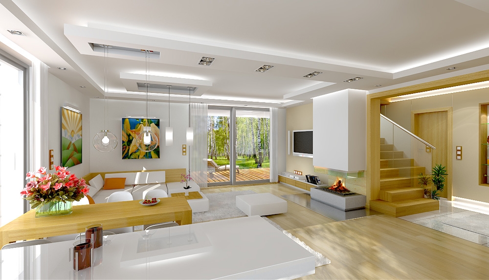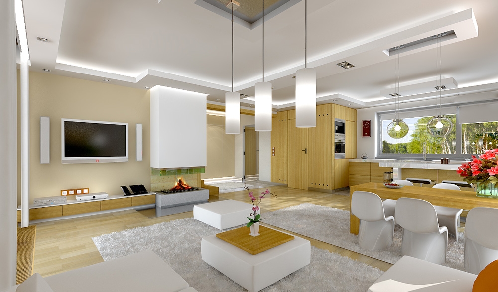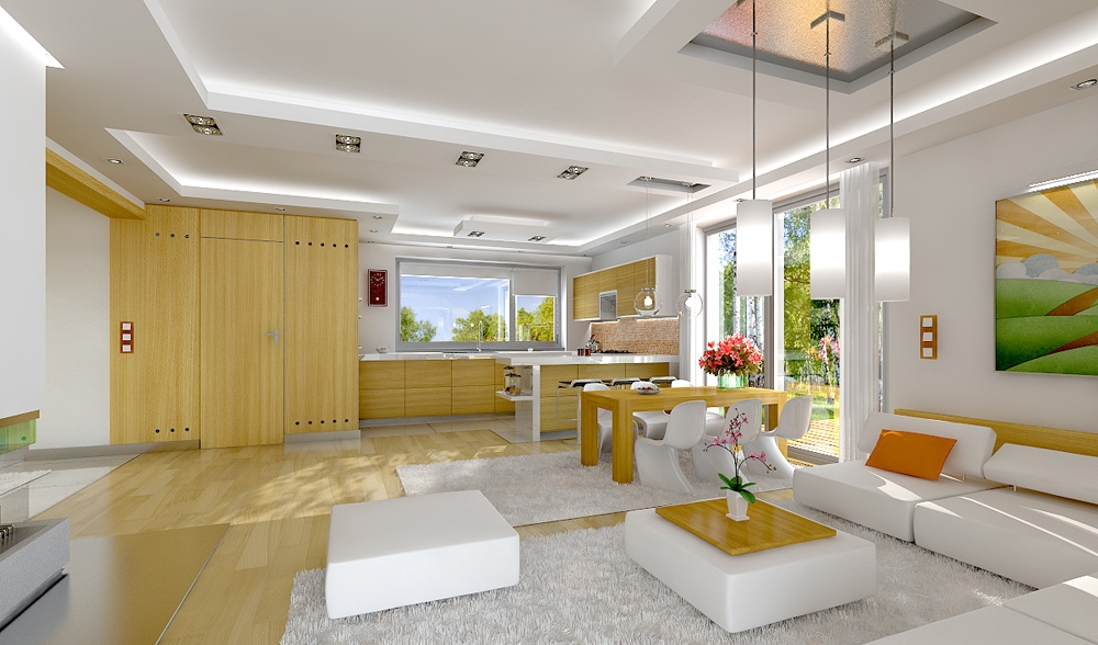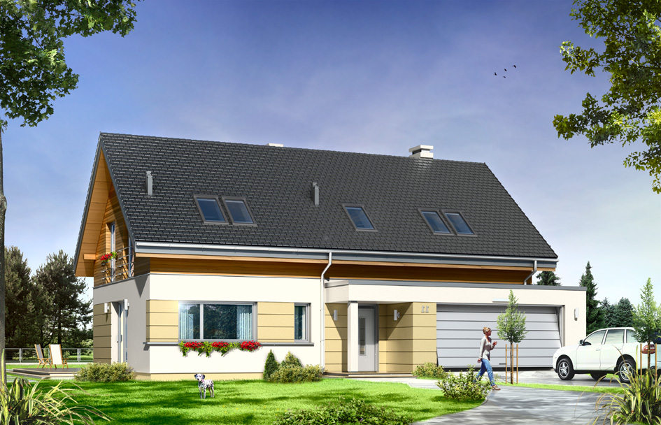 Party house is the prototype of which is bigger Gala. The project is designed for a family of four to five people. The building was designed as a one-storey villa with, covered by a gable roof. A simple block was complemented by partially protruding garage with a flat roof and roofed garden terrace. Modern architecture combines the simplicity of shapes and surfaces forming facades with nuanced detail, interesting colors and high quality materials. When designing the house we focused on simplicity and quality of the architecture. The interior of the house was divided into living and usable part on the ground floor and bedrooms in the attic. The combined living and kitchen hall form one open daily space. The interior decoration are nicely displayed from the entrance stairs. On the ground floor there is an extra room - a bedroom or office double garage and boiler room. In the attic there are three bedrooms: two children with built-in wardrobes and a shared bathroom and a comfortable parents' bedroom with a separate bathroom and dressing room. Party has everything you expect from a a single family house. This is a modern energy-saving easy and affordable to build and a later maintain and the interior is functional and spacious. There is also available a mirror version of this house plan.