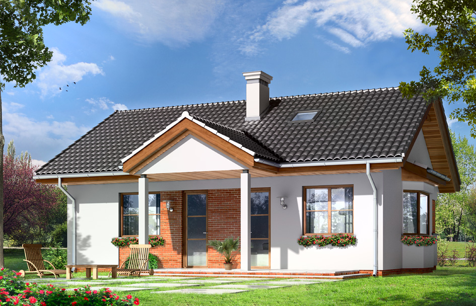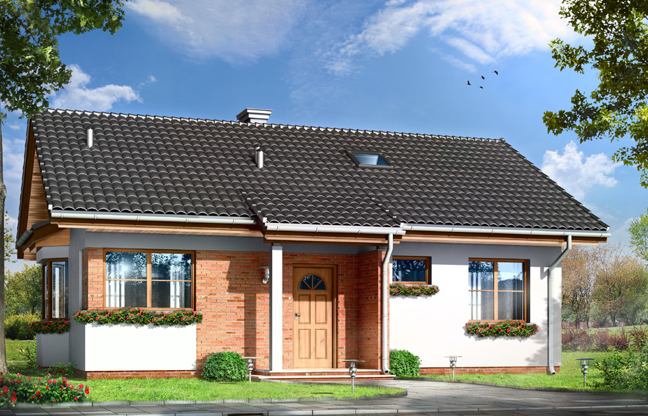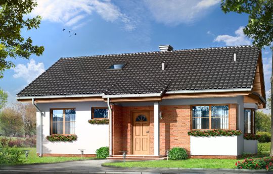 Pearl house plan is a story house, designed for a family of three-four people. Very similar to the popular Jewel house plan. This time Pearl house is covered with a simple, gable roof. Shape of the building was built on a rectangular plan with a garage add to the house, and enriched by entrance porch, bay window in the side elevation and garden veranda, which is a roof over the part of the terrace. Large nice glazing with divisions, fragments of elevations clad by the clinker tiles, modern materials - all these elements create a successful whole with the traditional shape of the house. The interior of the house Pearl is a comfortable three-room apartment with technical background. A representative living room with fireplace, connected spatially with kitchen and hall. Two bedrooms with private bathrooms are located in the opposite wing of the house, in the night part. Stairs leading from the atrium get into the attic - in the house plan Perelka attic is, non-usable, however, can be easily adapted for additional attic. On the side of the house one car garage was built. There is also available a variant in a mirror version.