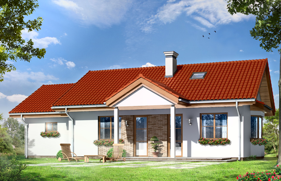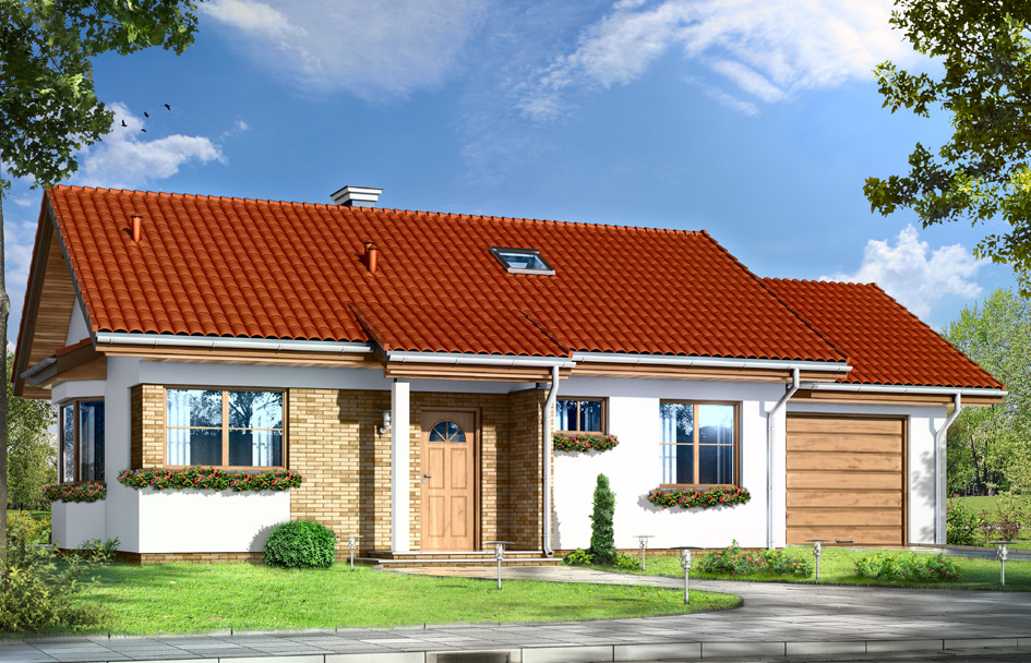 House plan Pearl 2 is a twin house similar to the popular house plan Jewel. This time the house is covered with a simple gable roof. This story house is designed for a family of three-four people. Shape of the building was built on a rectangular plan with a garage add to the house, and enriched by entrance porch, bay window in the side elevation and garden veranda, which is a roof over the part of the terrace. Large nice glazing with divisions, fragments of elevations clad by the clinker tiles, modern materials - all these elements create a successful whole with the traditional shape of the house. The interior of the house Pearl 2 is a comfortable three-room apartment with technical background. A representative living room with fireplace, connected spatially with kitchen and hall. Two bedrooms with private bathrooms are located in the opposite wing of the house, in the night part. Stairs leading from the atrium get into the attic - in the house plan Pearl 2 attic is, non-usable, however, can be easily adapted for additional attic. On the side of the house one car garage was built. There is also available a variant in a mirror version.