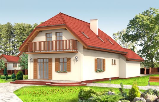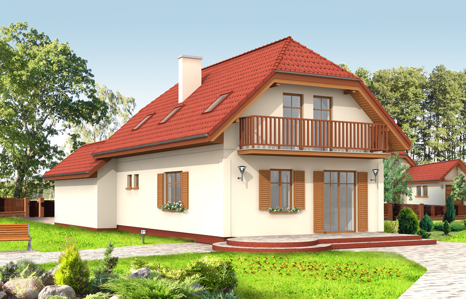 First house plan 2 is an advanced version of First house plan with the garage protruding to the front of the house. The building perfectly fits to the narrow plot. Simple construction and economy of form make this house affordable to build. The functional interior comprises: on the ground floor spacious living room with semi-open kitchen, utility room, garage and extra room, in the attic three bedrooms and a bathroom. We has a version with a garage on the side - First house plan 3, and without a garage - First house plan. There is also available a shorter version, without an extra room on the ground floor, and First house 2 in mirror version. The basic version of this house plan is available with two windows or one window in the gable wall in the attic above the entrance.
