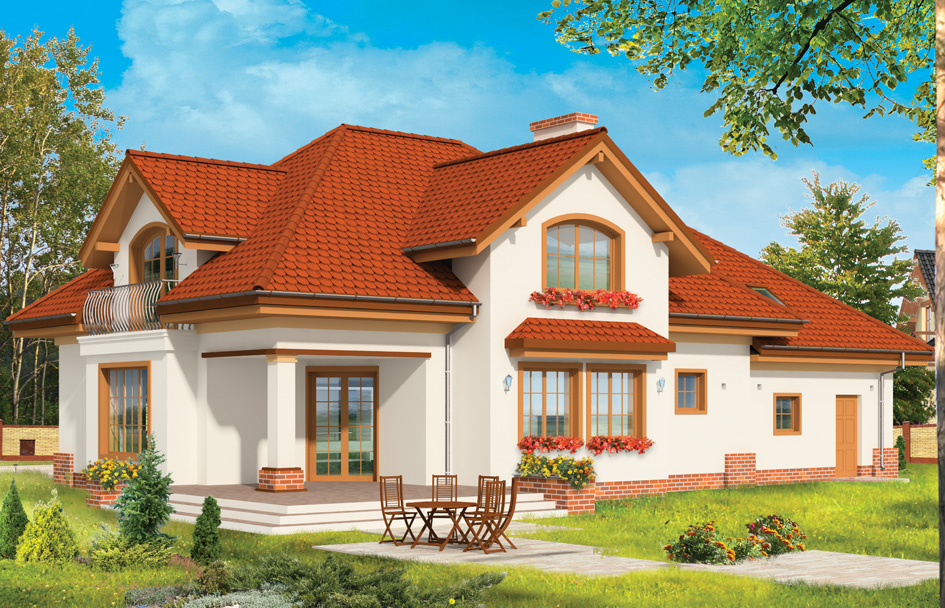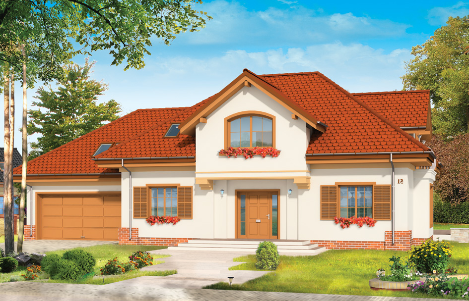 House plan under oak tree is a comprehensive storey villa with attic. It is designed for a family of 4 to 5 people. The building structure was covered with a hipped roof with large dormers on each elevation it makes the house look attractive from all sides. External appearance is diversified by bay windows, and balcony and a garden arcade. Front of the building will appeal to customers who appreciate traditional architecture, but not necessarily wanting to have columns at the entrance to his home. The interior of the ground floor is the combined area of the hall, living room, dining room and kitchen, and an additional room. In the attic are designed four rooms and an attic over the garage that you can freely use. There is also available mirror version of this house plan.