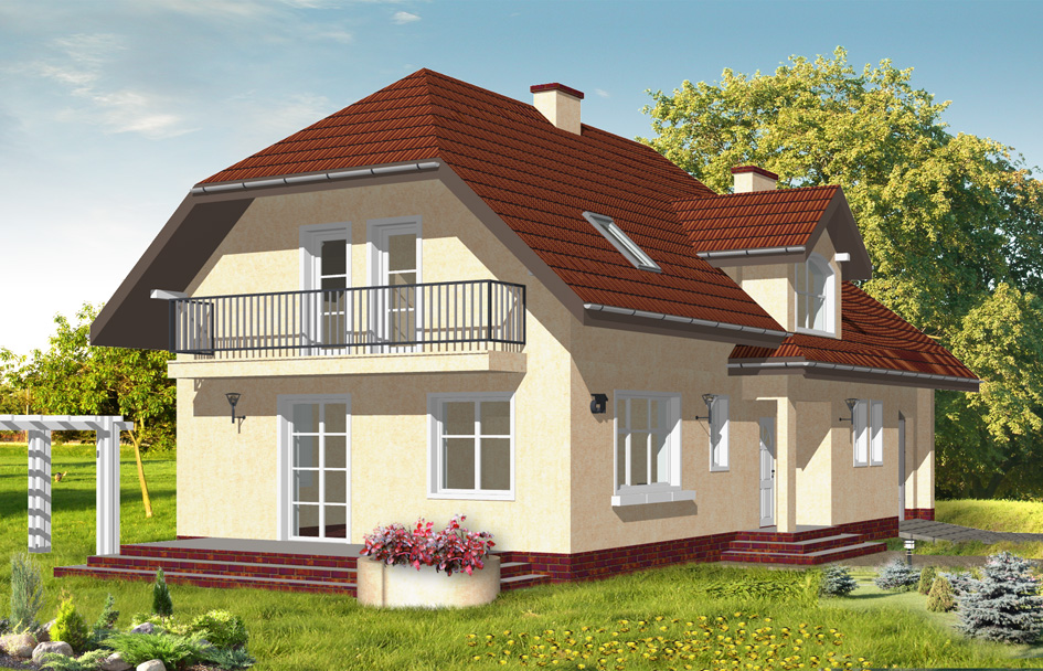 Cheerful 3 house plan is a representative villa with a garage, for a family of four-five people. The house has been planned in such way to fit well on a narrow plot of land, with a garden from the side. In the interior of the ground floor are: large kitchen with dining area, spacious living room with fireplace in the middle of the house, shapely lobby with comfortable stairs. In the attic three large bedrooms, bathroom, lounge with kitchenette and a loft above the garage, which can be used as an extra room was designed. Cheerful 3 house plan is also available in a mirror version.