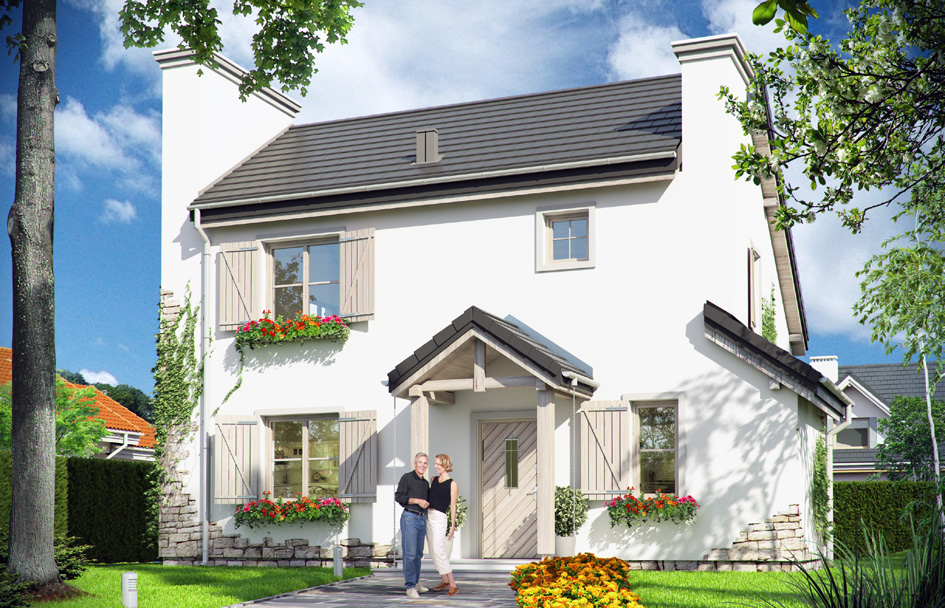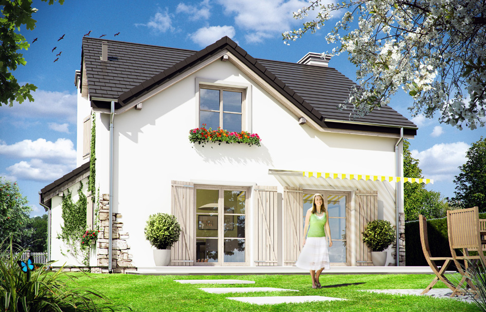Provence house plan is a charming detached house - original, with an uncommon style. Provence - as the name suggests refers to the architecture of the Mediterranean villas, so beautifully composing with the environment and nature. This house plan is intended for permanent living for family of four people, it can be both a residential house and a summer residence. Provence house best fits in with the surroundings with more green space, or in proximity to other homes with soul. Styled as village resident form of house hides a modern, energy-efficient building, designed with the latest materials. Simple solid of building with a gable roof over the attic will allow for inexpensive construction. The only extravagant elements are artificially increased two massive chimneys in the gable walls constituting largely for its style and silhouette. The front elevation is a little more formal, while at the back, by using large glazing, the house gently opens to the garden. Interior of Provence house is living area on the ground floor and bedrooms on the top floor. At the bottom a nice open daily space was obtained, from a combination of living room, hall - with a nicely exposed staircase and a kitchen. In addition, from the vestibule we have access to a large boiler room, and from the lobby to the extra room - office or guest bedroom. In the attic thanks to the high elbow walls we did not almost have bevels in the bedrooms. Thanks to this the space of all three bedrooms, comfortable bathrooms and dressing rooms can be fully utilized. Presented house has a simple structure, it should be easy to build. It has a favorable ratio of surface area to volume envelope - just like in storeyed buildings. Is partly a storey building, although officially it can be treated as a house with attic. There is also available a mirror version of this house plan.