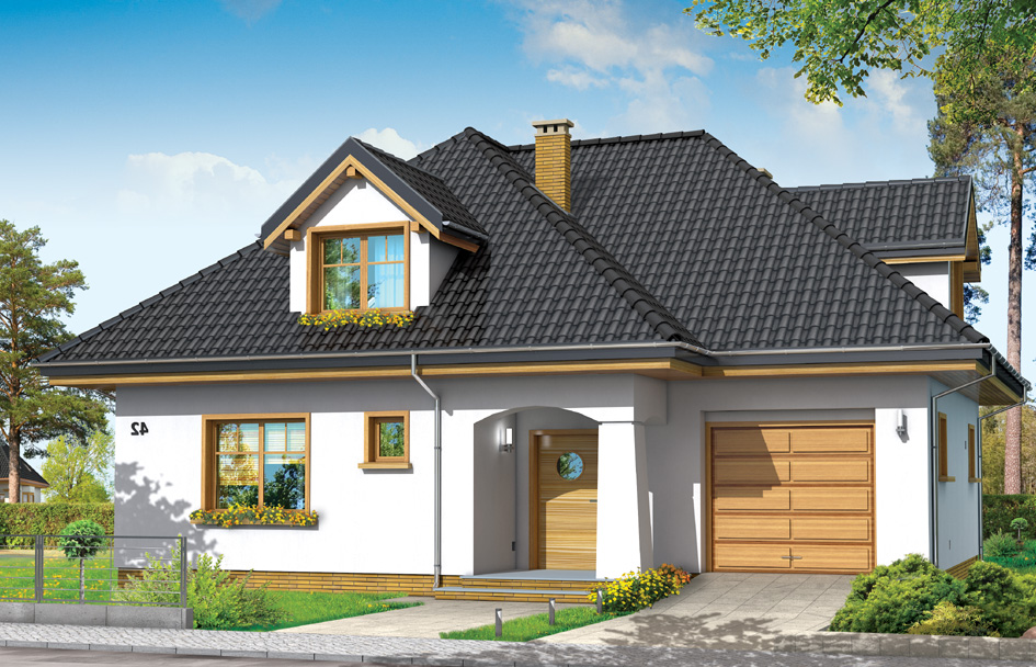 Primus house plan is designed for a family of four-five people. This is a one-storey detached house with attic. The main body of the building, along with an added part of the garage has been covered by a hipped roof. The facades are decorated with three roof dormer windows, a corner entrance arcade supported by column, the dining room bay window and a large balcony of parents' bedroom in the attic, supported by two pillars and at the same time being a part of the roof garden terrace. Quiet, toned architecture of the house adapts to any environment, and the right proportions and elegant detail will fully enjoy this interesting house plan.. The interior of the house was subordinated to the functional layout of the rooms and the simple arrangement of the design of the building. On the ground floor there is a single daily space with a living room, dining room, foyer and partially open kitchen. The exposed representative stairs are also a decoration of the ground floor. In addition, on the ground floor provides room which could be used as office or extra bedroom, and the technical part - with a garage and boiler room. In the attic of Primus house are designed three spacious, separated bedrooms with wardrobes and a large bathroom. There is also available a mirror version of this house plan.