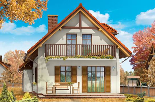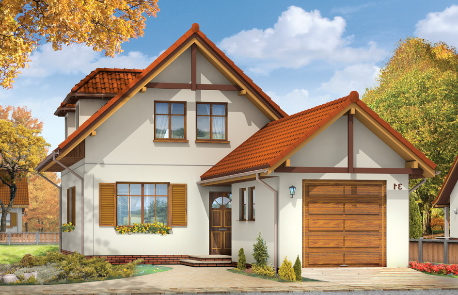 Pooh house plan is a a detached house with usable attic for a family of 4-5 people. House with garage extended in front by the front wall of the building fits perfectly to a narrow plot of land or plot on a busy street, where the investor wants to acoustically and visually separate themselves from the road. Pooh house plan, although it is little has on the ground floor a spacious living room with fireplace, with dining area, open to the kitchen and hall, with visible staircase. In the attic there are three bedrooms and a bathroom. The house is simple in the structure and easy in construction. Sympathetic, graceful appearance goes hand in hand with a comfortable and functional interior. There is also available mirror version of this house plan.
