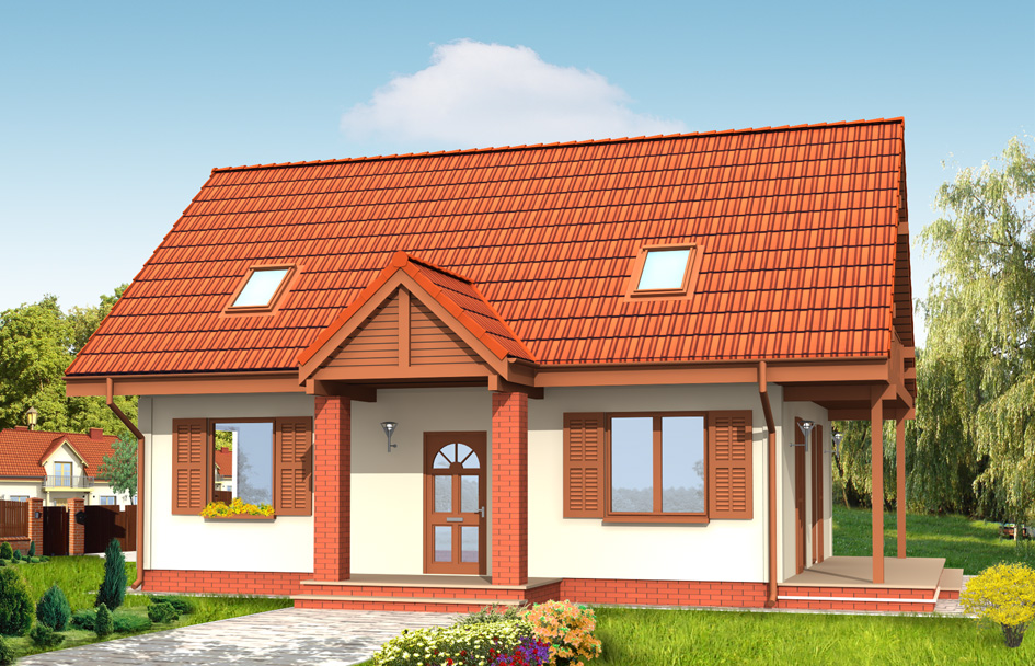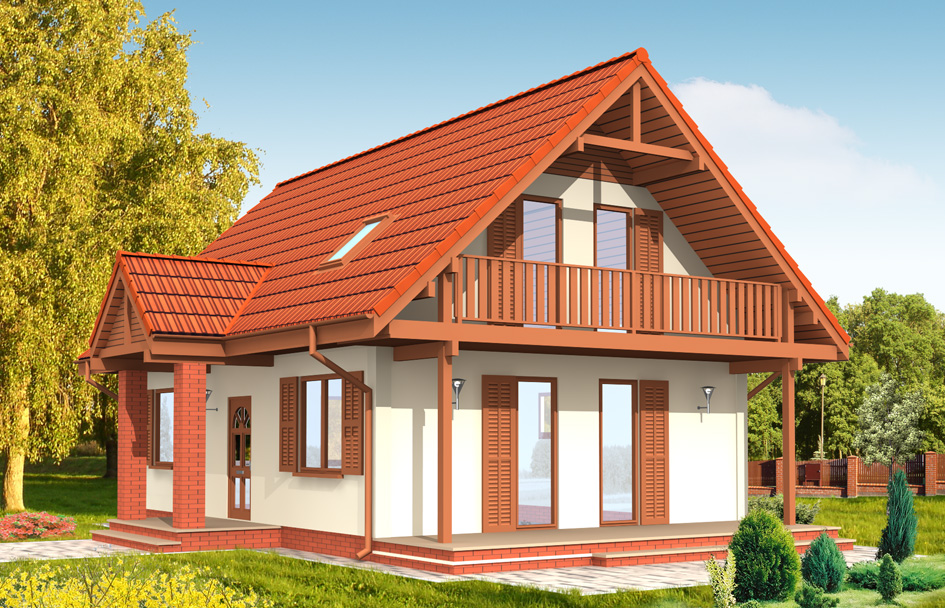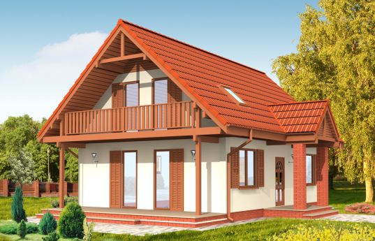 Joyful is a house for a happy family. It can serve as a single family - can also be a holiday house. The simple shape of the building with a gable roof is decorated with a entrance porch and roofed balcony on pillars. On the ground floor is designed as a single space , with a large kitchen-dining area and a living room. On the ground floor you can save an extra room by moving the dining room to the living room. In the attic there are planned three bedrooms. There is also available mirror version of this house plan.