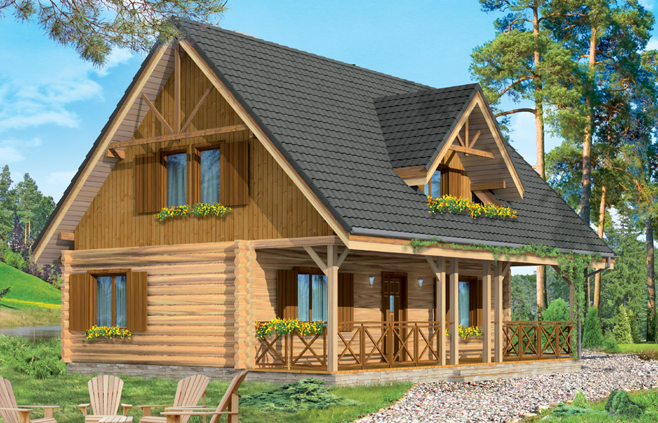 Ranch house plan is a the building with a solid log, insulated from the inside. This is a storey house with usable attic, designed for a family of 4-6 people. Ranch house can be used as a year-round residential building, but also as a holiday house. The building, thanks to its simplicity, reminds country houses. At the same time its architecture does not refer to any regional folk design, form is so universal. A large gable roof with eaves, set in the middle of the front elevation dormer with balcony, a veranda with a width of whole house supported on pillars with braces - these elements can easily associate with the idyllic countryside habitat. House is facing one way - front elevation is also a garden elevation. It is popular with recreation plots. The division of the interior of the house is also very traditional and reminds the old country houses or manors: the central part is a hall with a vestibule and stairs, on the sides are a living room and kitchen, and a utility room. Great roofed terrace - front veranda give shade from the sun and shelter from the rain. In the attic there are three bedrooms and a very nice bathroom. In addition, hall opens onto a picturesque little balcony. There is also available mirror version of this house plan.