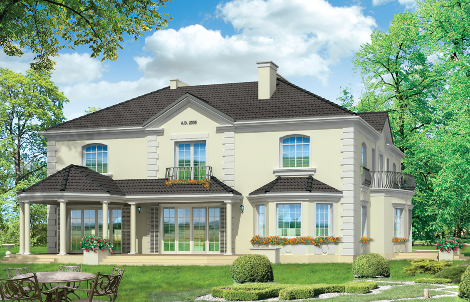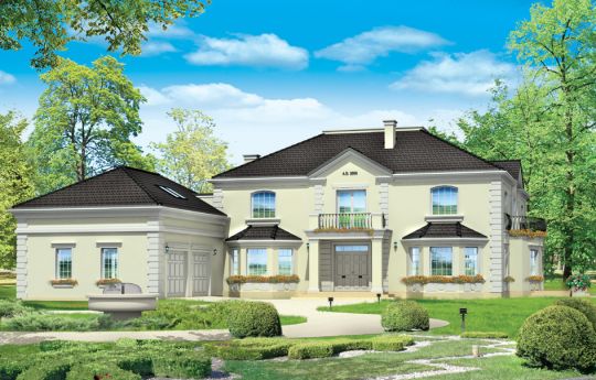 Regent house plan is an elegant, extended residence for the lucky ones with a beautiful plot. Regent has all the necessary functions: representative hall with a beautiful staircase, large dining room and living room, an extensive library and a beautiful kitchen. At the entrance was designed large, comfortable dressing room. On the first floor was planned parents' apartment with bathroom and dressing room, and two additional bedrooms - with private bathroom (alternatively can also be two bathrooms - separately for each room). On the first floor there is also one spare room. In a separate wing of the house is a large garage with utility space. Above the garage in the attic room was designed sport and recreation room accessible from the ground floor separate staircase. Regent house is designed in such a way as to avoid frequent in large houses accumulation of smaller spaces - there is not much room, but they are large. Of course, a house can be freely arranged inside - in accordance with the clients wishes. There is also available mirror version of this house plan.