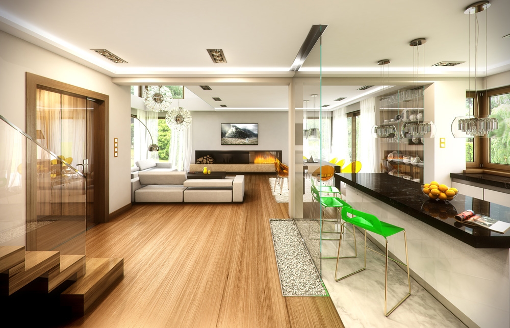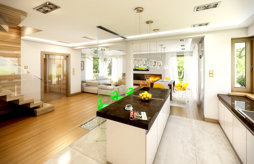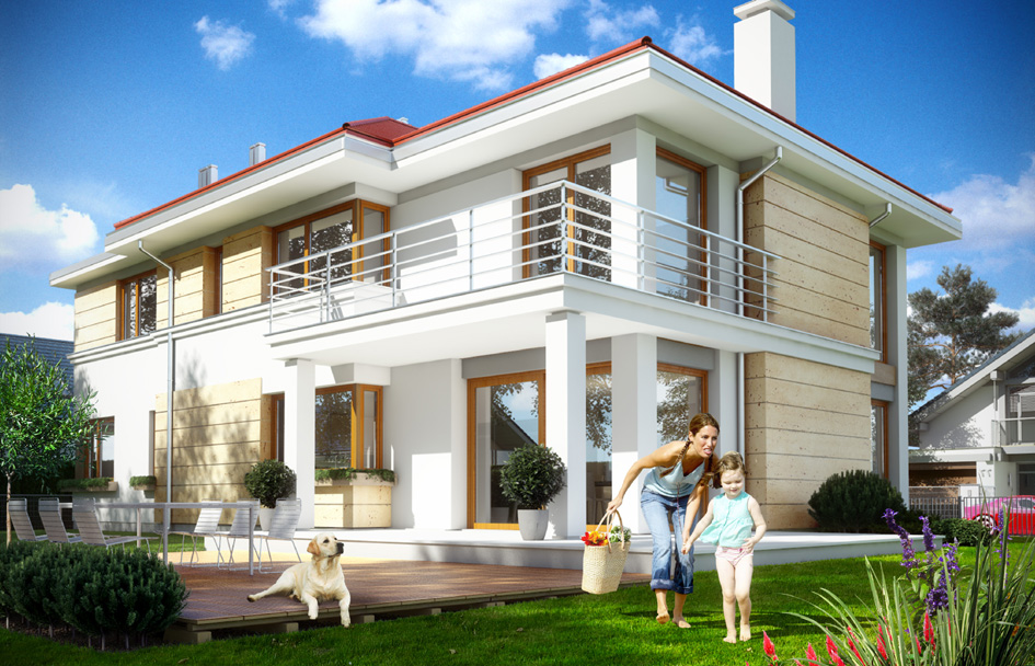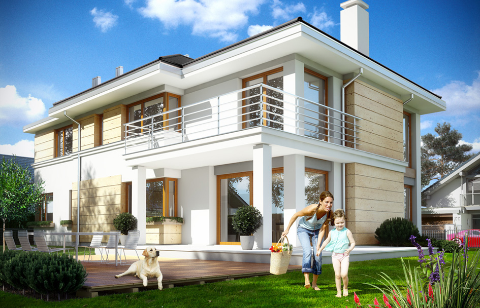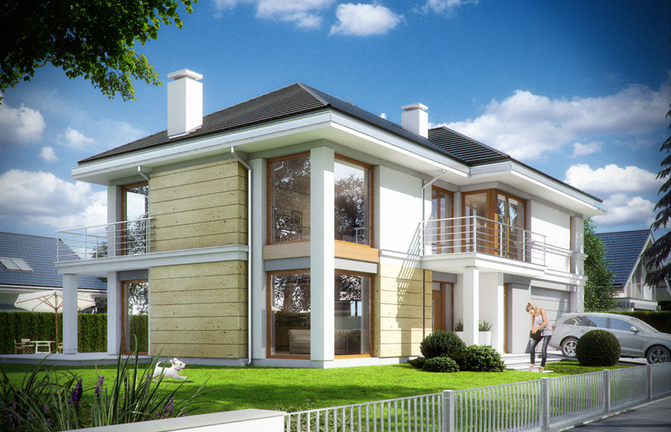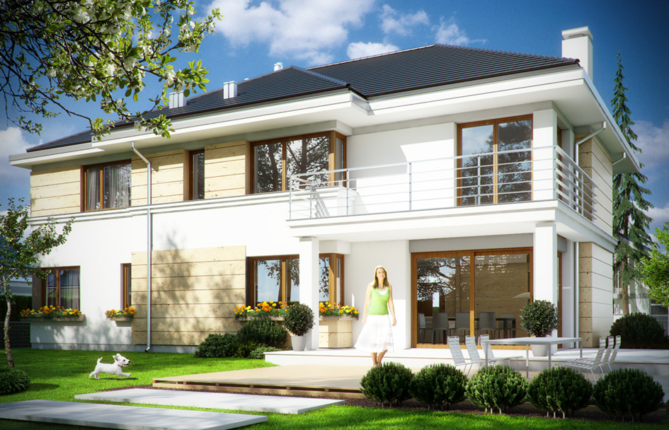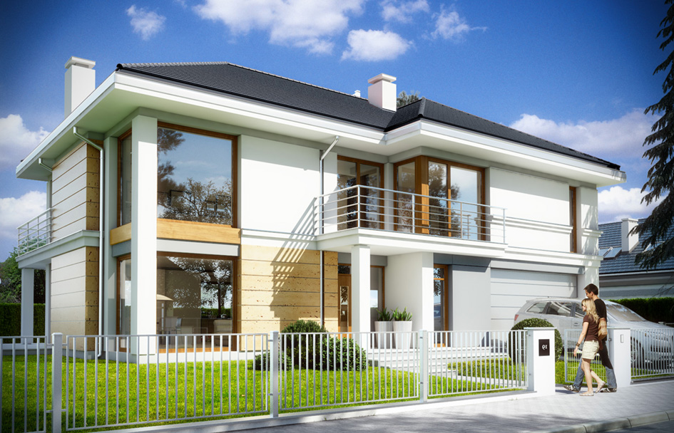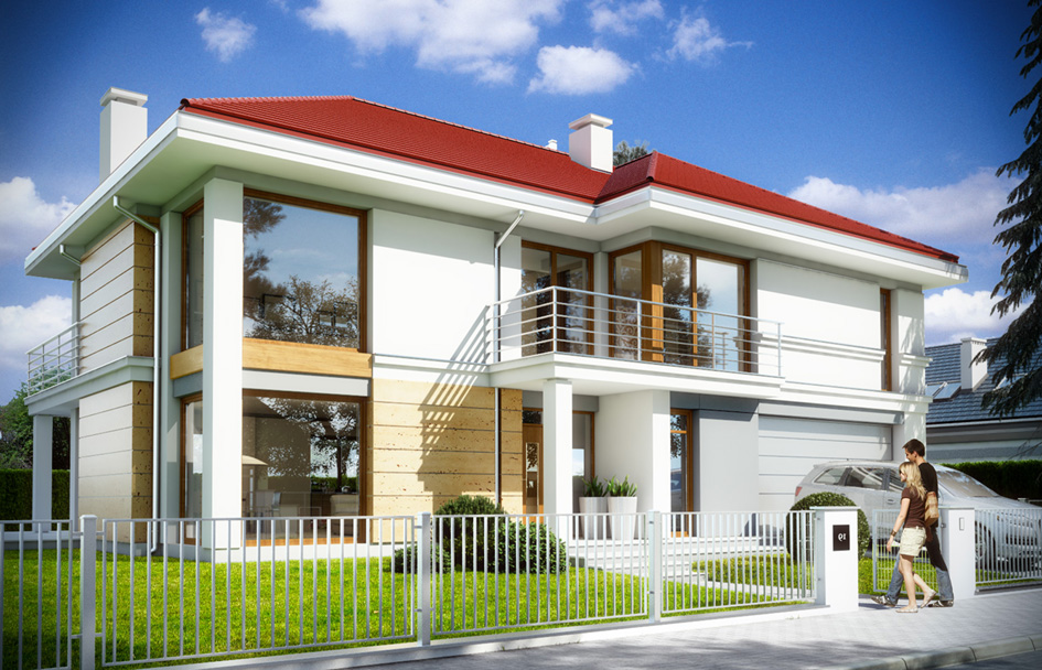 House Riviera 3 is another version of the popular house "Riviera" - this time house is extended, and is suitable for shallower and wider plot, with a garden in the back side of corner. Riviera 3 is a convenient comfortable house for a four-family of six. On the ground floor there is living space lounge, lobby with representational decorative staircase or kitchen and part of utility rooms with a garage and boiler room and extra room - office or bedroom guest's. On the first floor there are four bedrooms, and a separate parent’ apartment with bathroom and a large walk-in closet. Both floors combines an open emptiness above the living room and entresol of extensive lobby on the first floor. As a result, the interior of the house is very attractive and would be even greater. Exterior view of the building is a modern block covered with a hipped roof, with elevation separated by horizontal stripes of cornices, diversified by large glazed windows. The architecture of the house is both modern and unpretentious. The building especially will appeal to those who have a difficult plot - with road from the sunlit side. People who on the one hand must to let a lot of light into the living room and rooms from the south, on the other hand they do not want to have the terrace in front of the house, only the garden behind the house or on its side.