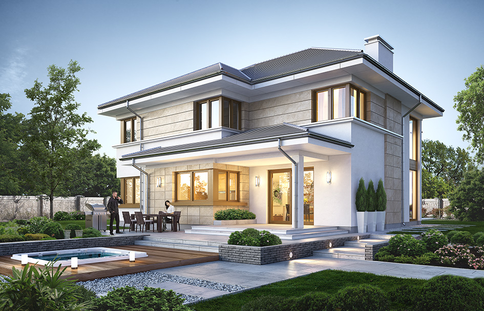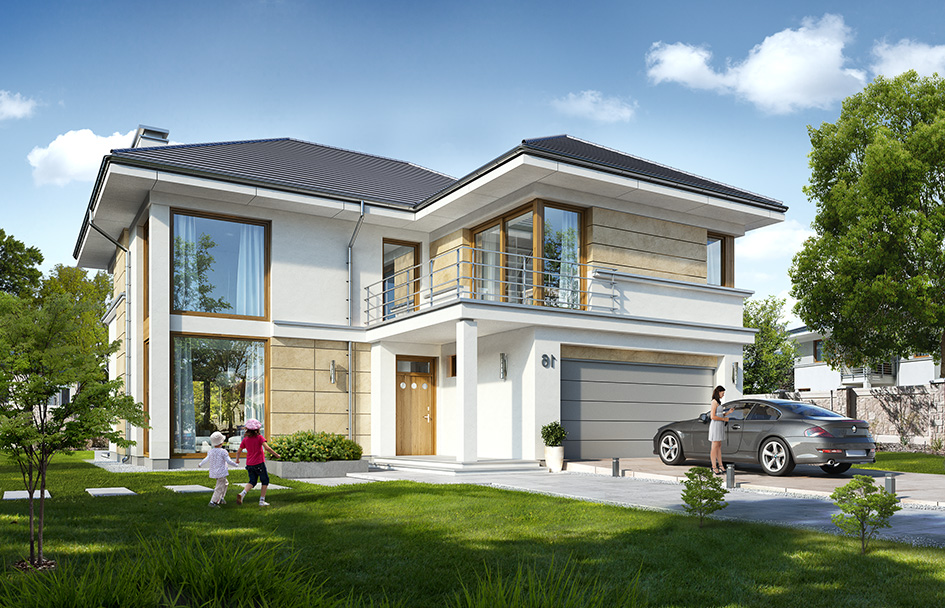 Riviera 5 house plan is next variant version of popular house plan Riviera - this time without basement, with roof of higher angle, and with a variant version of interior: with emptiness and a entresol above the living room, and without emptiness. This story house, built in a "T" letter with a protruding slightly to the front part of the garage. It is covered by hipped tile roof. Modern block was decorated with large windows, stone wall claddings, rustications and cornices separating the ground floor and first floor. Particularly spectacular are corner windows in the living area connected to the first floor windows. The architecture of the house is modern, at the same time restrained, toned down and not exaggerated. As a result, the building does not lose its coziness. Thanks to the arrangement of the interior and the appropriate location of windows can be placed on the property with entrance from the south. Interior: on the ground floor there was design an open space daily - in the version with emptiness above the living room. Kitchen with island separated from the lobby by decoration glass wall of living room. Living room, dining room and lobby together form a beautiful interior. On the ground floor we have an extra room (study or guest bedroom), a toilet, a boiler room and a garage for two cars. On the floor, depending on the version (with or without emptiness) we have three or four bedrooms, 2 bathrooms, dressing rooms and a laundry. Parents' bedroom is a separate apartment with bathroom and two dressing rooms. In the version with emptiness above the living room we have a beautiful entresol which is a continuation of the living room. House plan Riviera 5 - front visualization - mirror version is an attractive, modern house, with energy-efficient solutions.