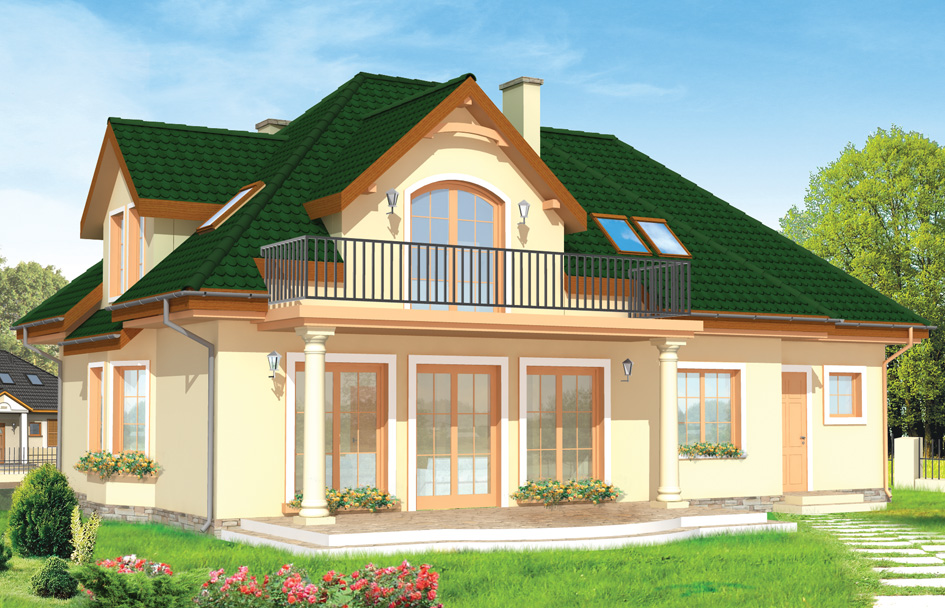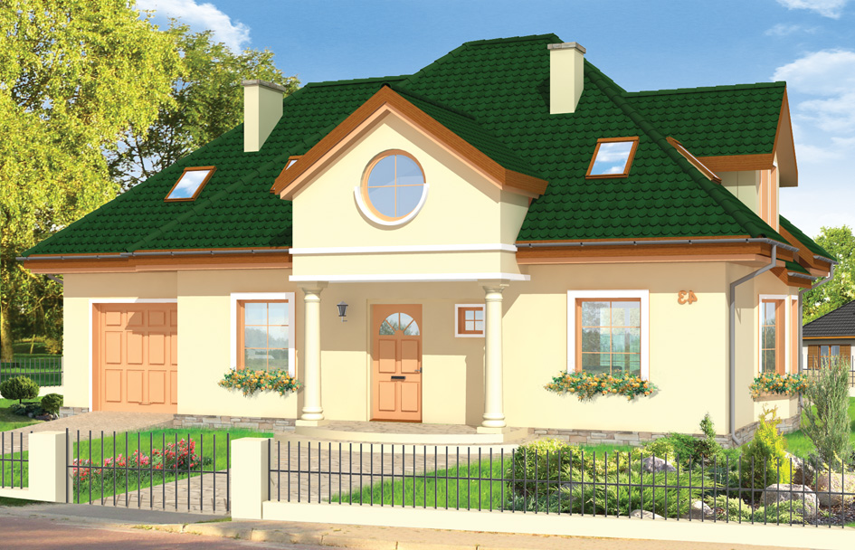Saga house plan is a building of classic architecture, referring to the Polish manor house. This is a detached house for a family of 4-5 people. The project has a hipped roof attached to the dormer windows, the original entrance portico with columns and a circular window give the block a curious expression. Details - such as the dining room bay window, large balcony with arcade from the garden diversified whole. Inside the house was designed spacious living room with dining area accented by gentle bay window. House has large glazing which the interior opening to the terrace and garden. Partially open kitchen with hall increase the surface area. On the ground floor there also was designed an extra room, garage and boiler room. In the attic there are three bedrooms with wardrobes and a bathroom. In addition, the project gives the possibility of utilizing the attic above the garage for the room. There is also available mirror version of this house plan.